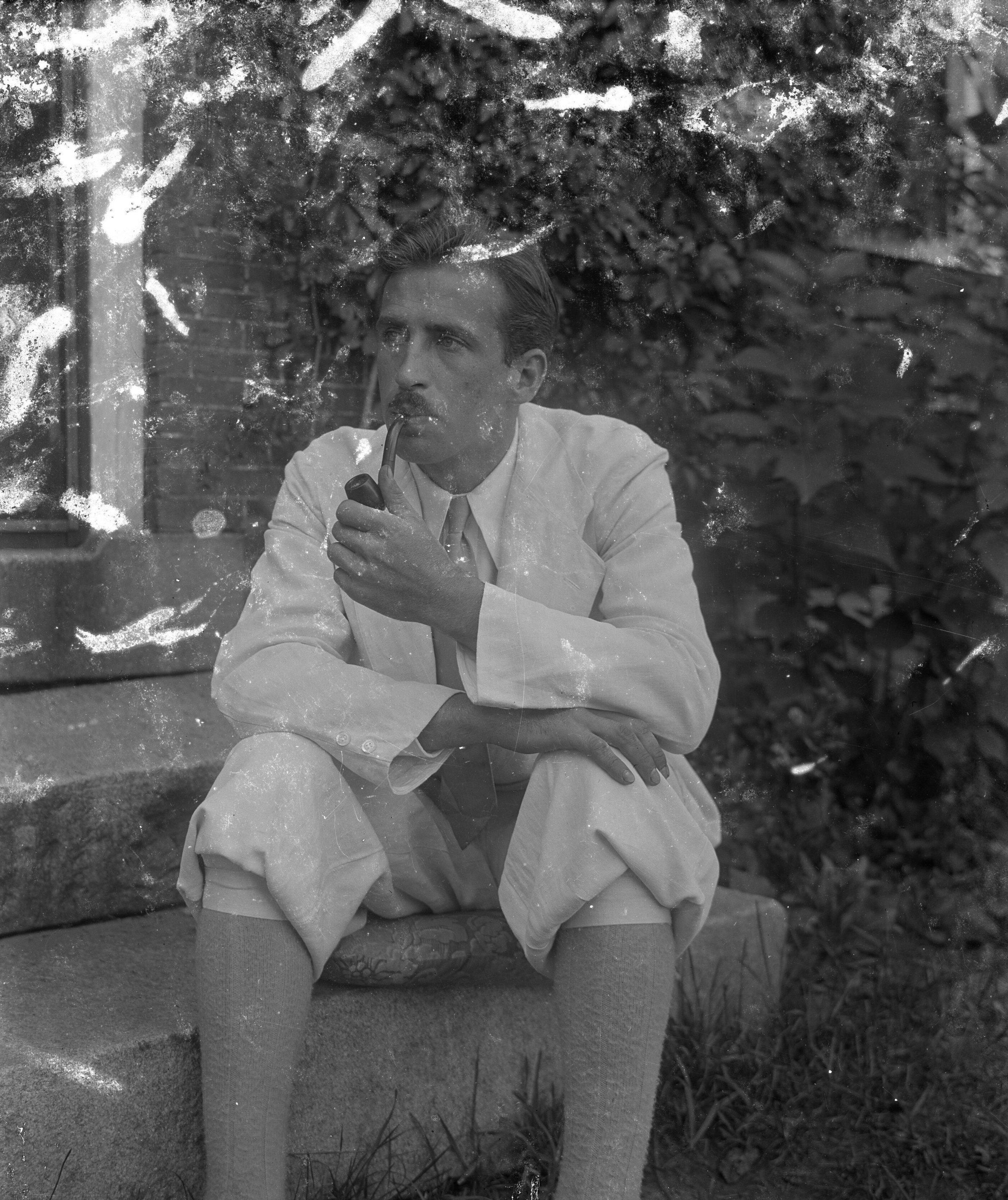 Glass plate negative photo of Charles A. Bradbury (older) smoking a pipe. Plate is heavily deteriorated.