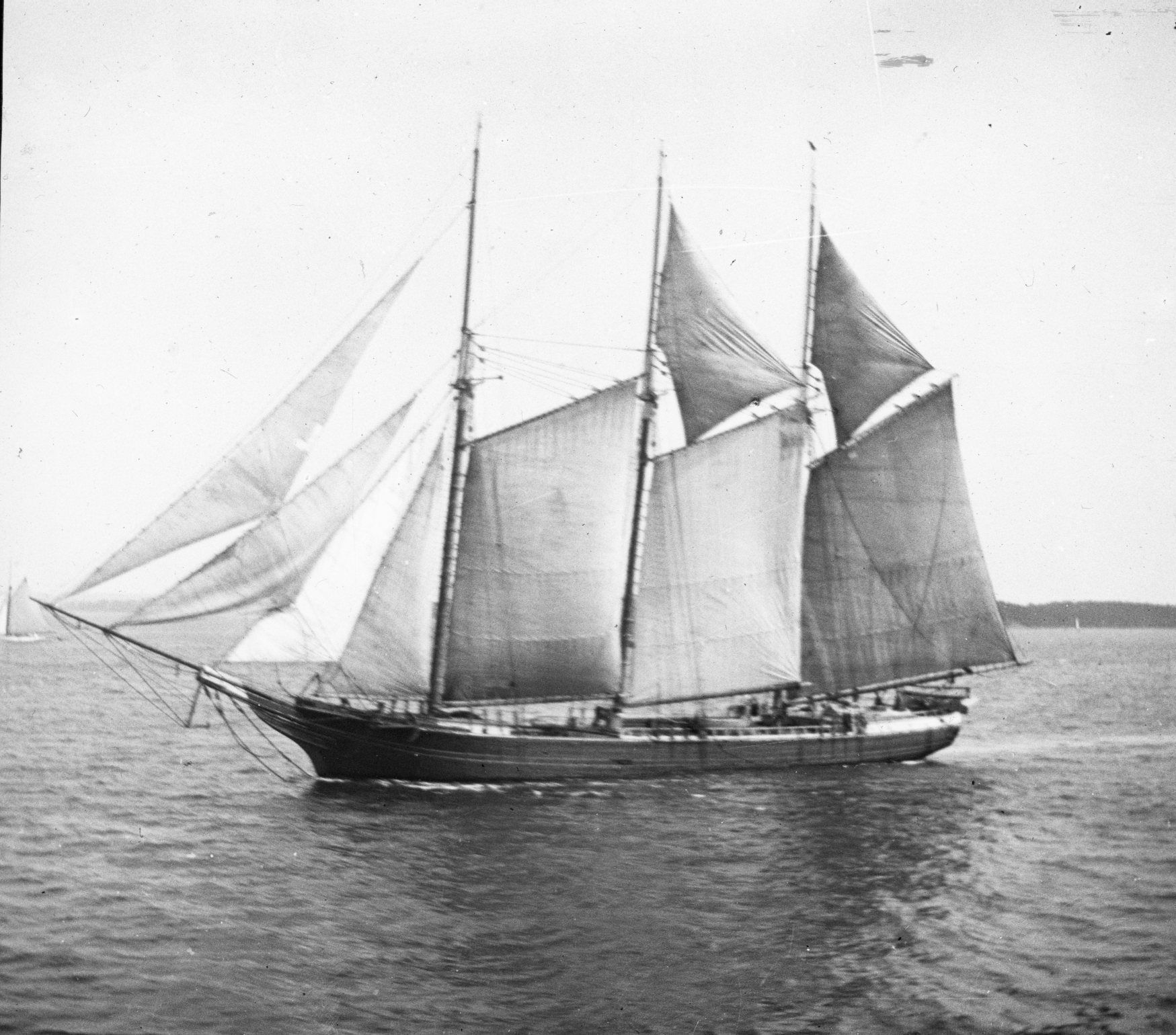 Glass lantern slide of schooner on Long Island Sound, NY. "On the Sound" is written on the label on the slide.