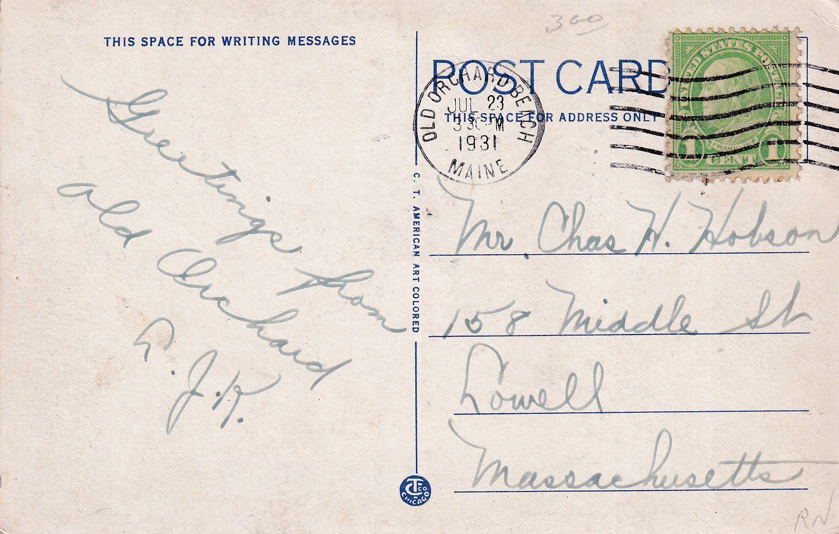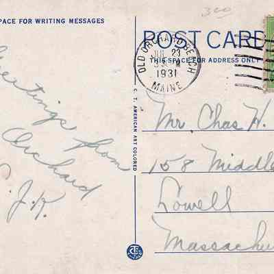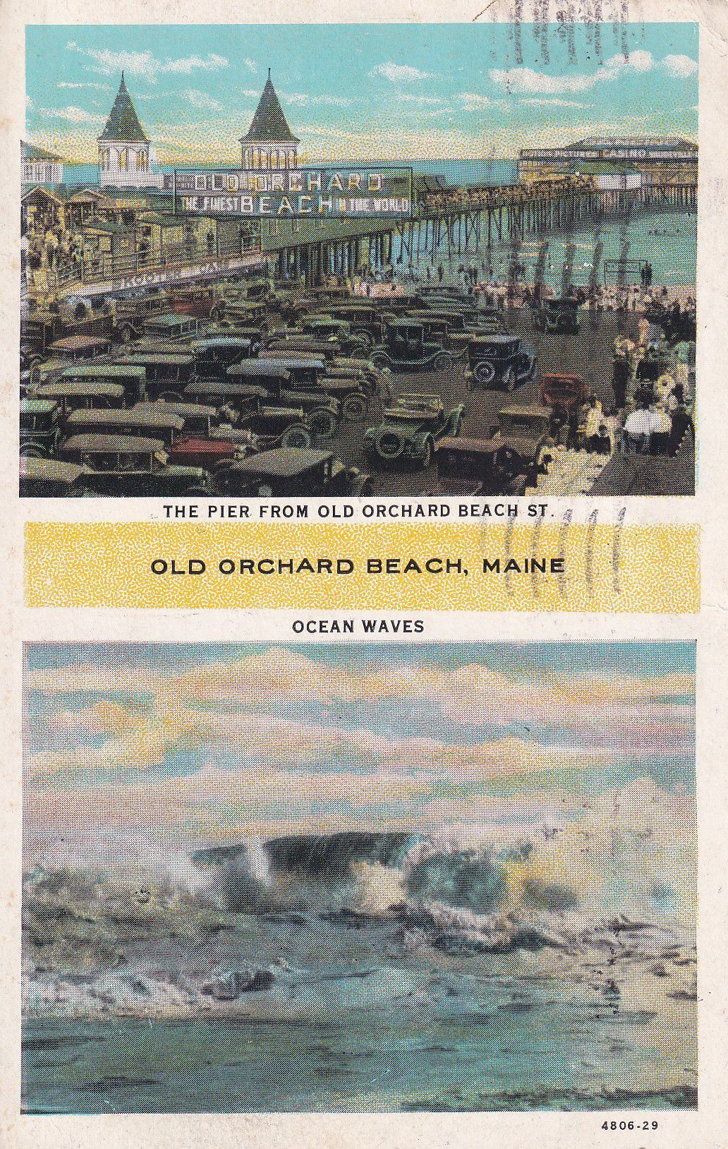A postcard bearing two colorized images. One image is of many parked cars just outside the entrance of the pier. The other image is of a crashing wave.