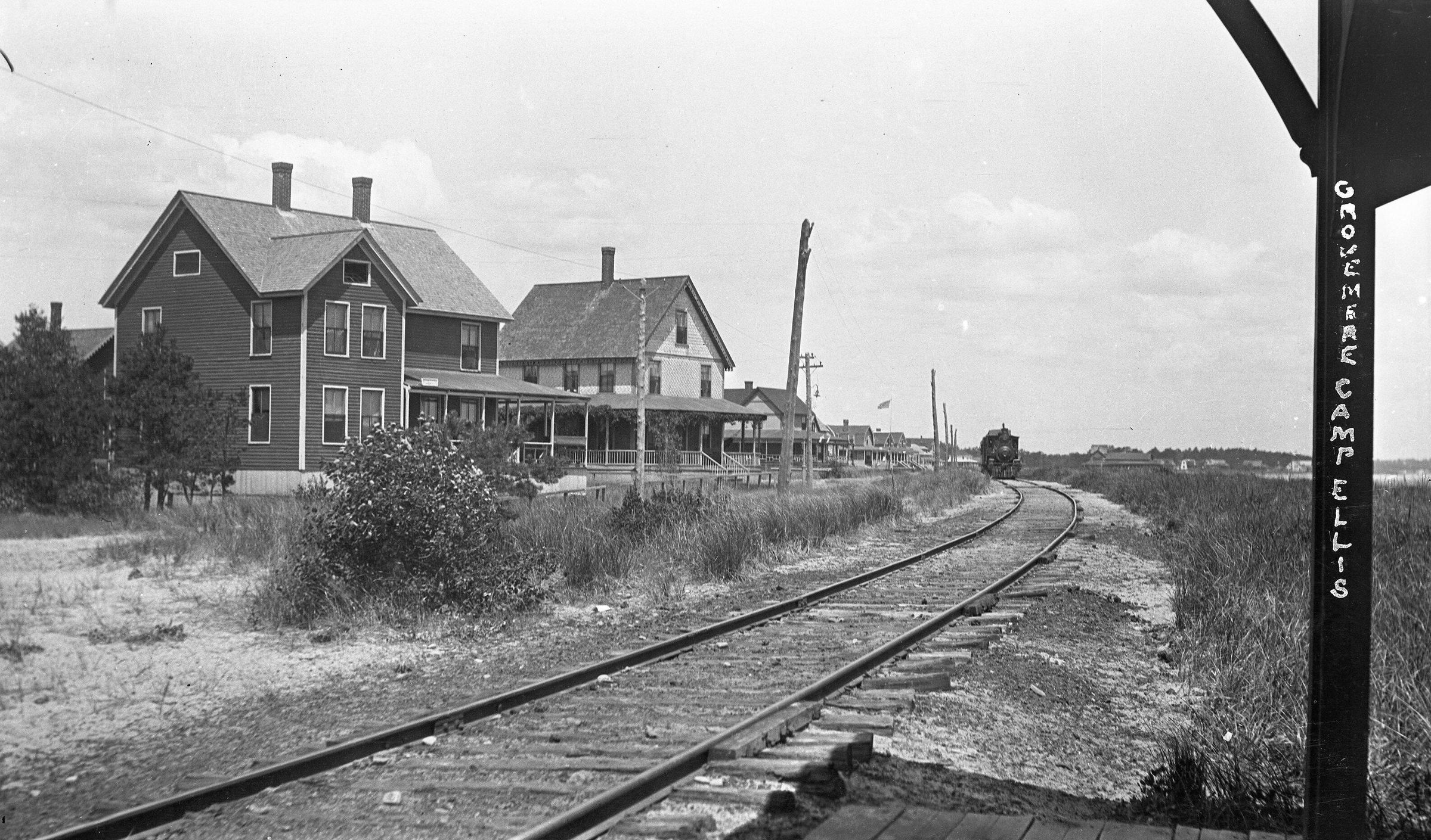 Negative print photo of the Grovemere station on the Dummy Railroad. Grovemere was the second to last stop before the terminus at Camp Ellis station. This area is now underwater since 1973 due to coastal erosion.Made/Created
