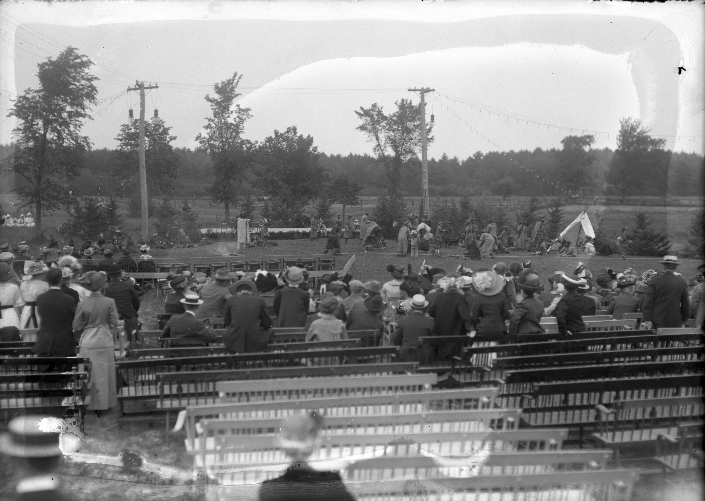 Glass plate negative photo of the Thornton Academy Centennial Celebration, June 19, 1913. Students dressed up as Native Americans and performed the scene "Indians on the banks of the Saco River." Thornton Academy put on a "History of Saco" pageant to celebrate the founding of the school (also see photo of program booklet from Dyer Library archives).