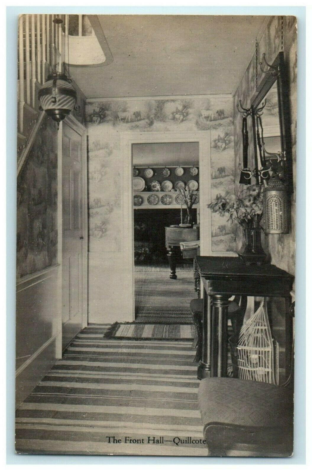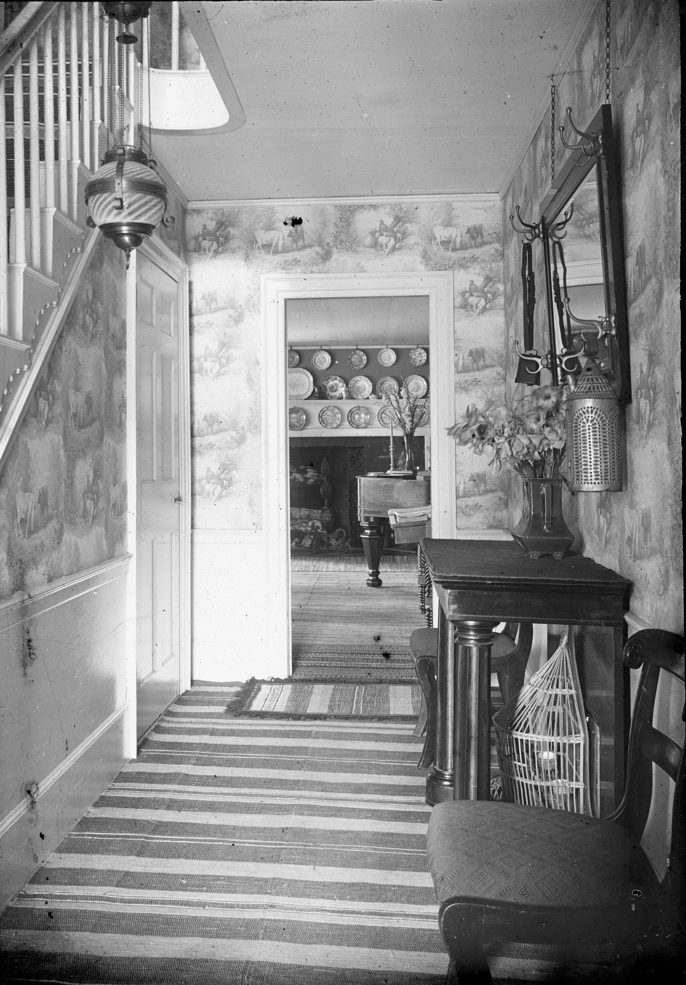 Glass plate *positive* photo of the interior of a hallway in the Quillcote house, author Kate Douglas Wiggin's residence in Hollis, Maine. This image of the "The Front Hall" has appeared on postcards. Many of these photos of Quillcote appear on postcards that are still widely available today and sold by antique ephemera dealers.Made/Created