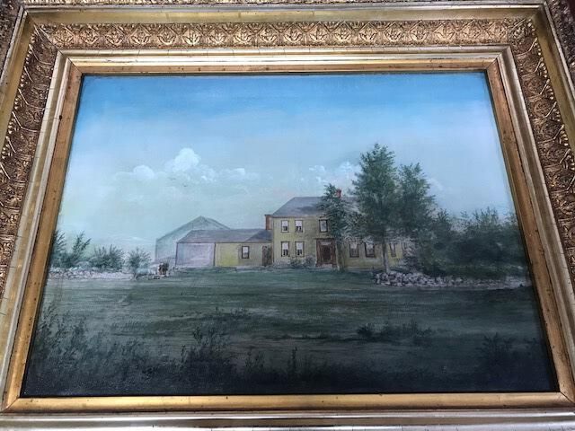 Framed painting of an ochre-colored two story house with red trim and two-over-two windows, a red door with transom above, and a central chimney. An attached ell off to the left of the house has a single door, window, and chimney and is painted half ochre and half gray like the barn behind the ell. Three trees of varying heights, green at the uppermost branches and with trunks exposed nearer the ground block the right side of the front and side of the house. A stone wall curves away from the middle and tallest tree; another stone wall is set slightly back and runs along the left middle ground behind the people and cow. A man dressed in black with a yellow (straw?) hat stands beside a child dressed in red. To the right of them is a cow feeding or drinking from a large bucket. The sky is blue with a few low white puffy clouds. Green grass and shrubbery complete the picture. The painting is identified, signed, and dated on the back in GEB's hand.Artwork Details