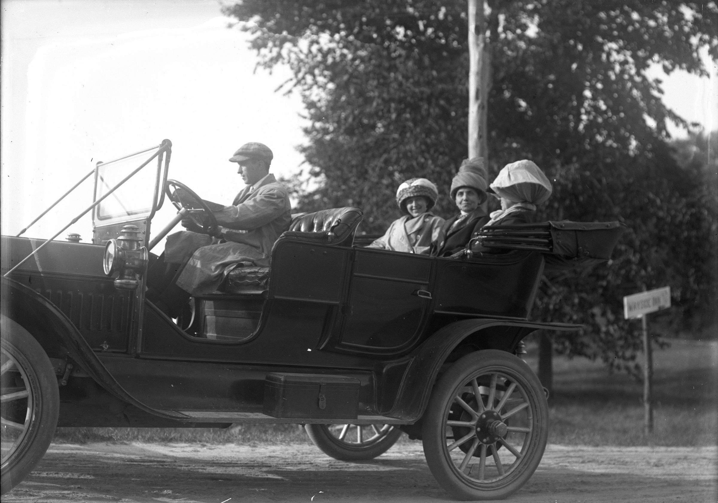 Glass plate negative of a three women and one man in an automobile. The smiling woman on the left is Ella Winifred Cole Sawyer. Her husband, Howard B. Sawyer is driving. A sign on the right of the car says "Wayside Inn," likely the Wayside Inn in Buxton, ME.Made/Created