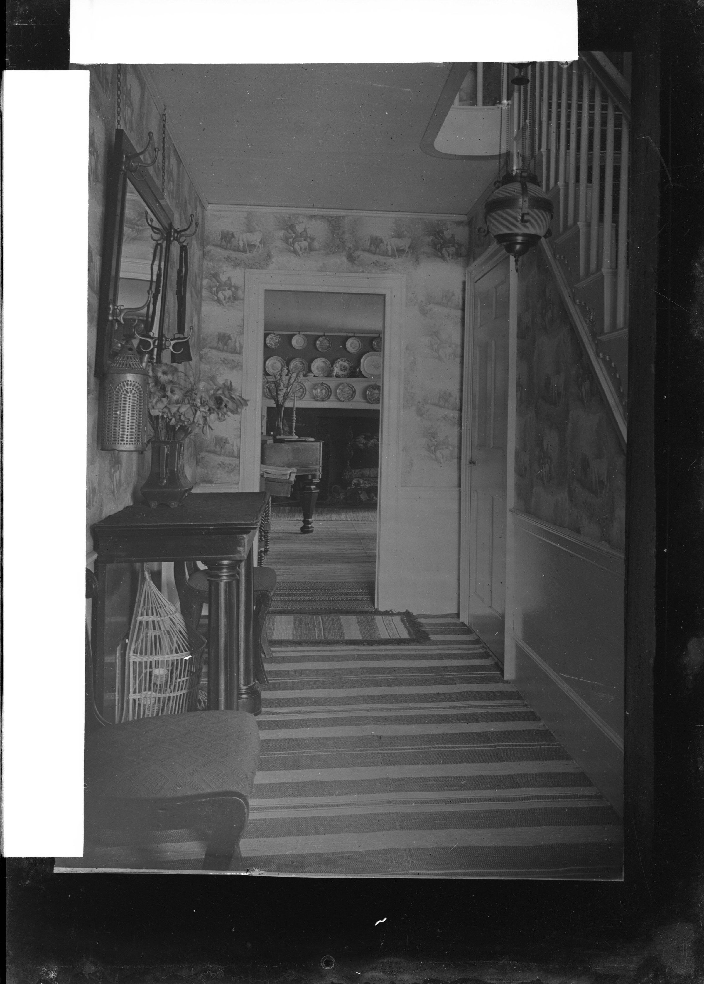 Glass plate negative photo of the interior of the Quillcote house, author Kate Douglas Wiggin's residence in Hollis, Maine. The back side of the negative has a section of a postcard pasted on. The photographer Bradbury was likely sizing these photos to create postcards. It looks as though this plate is actually a photograph of a photograph. This image of "The Front Hall" has appeared on postcards. Many of these postcards of Quillcote are still widely available today and sold by antique ephemera dealers.Made/Created