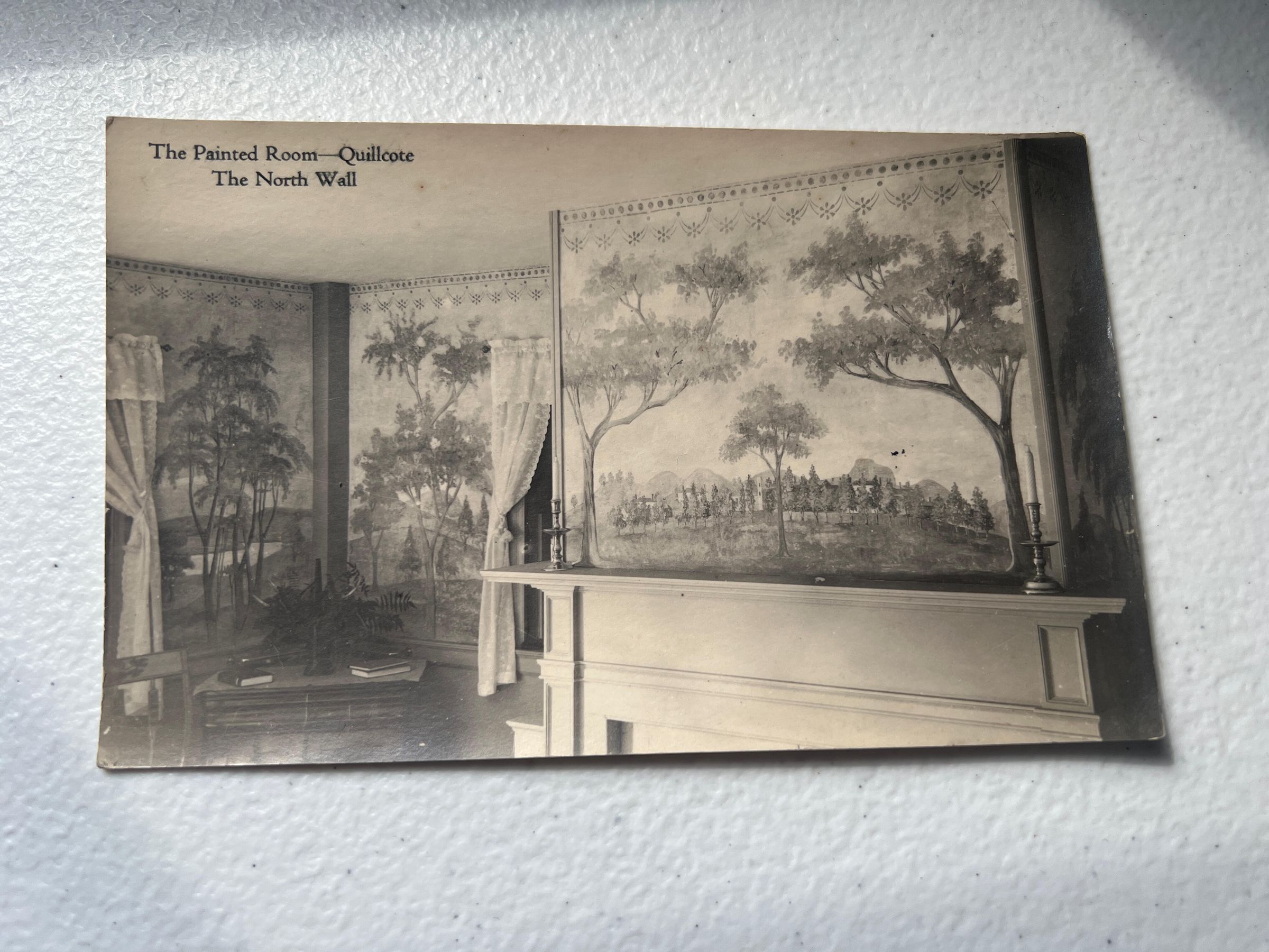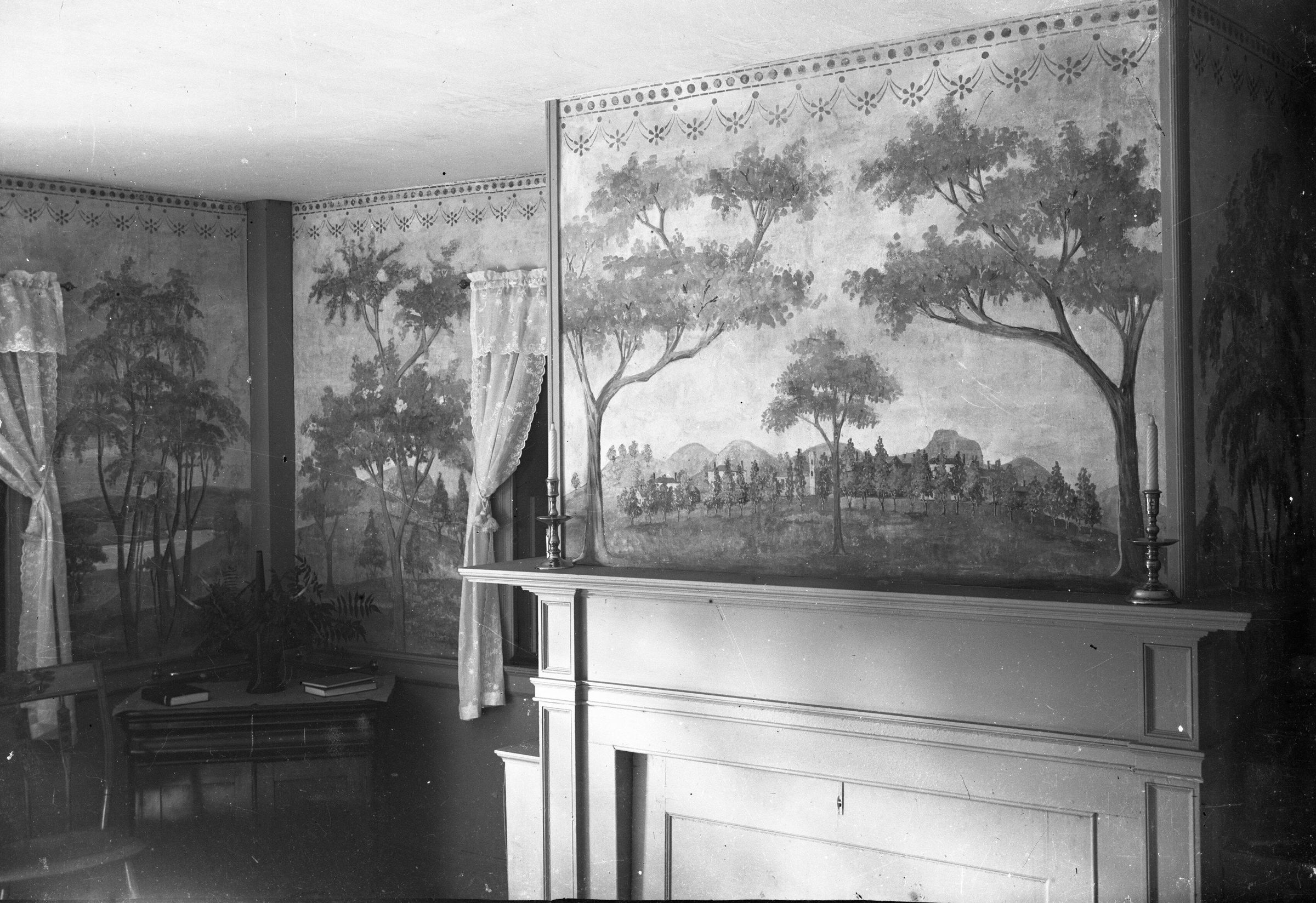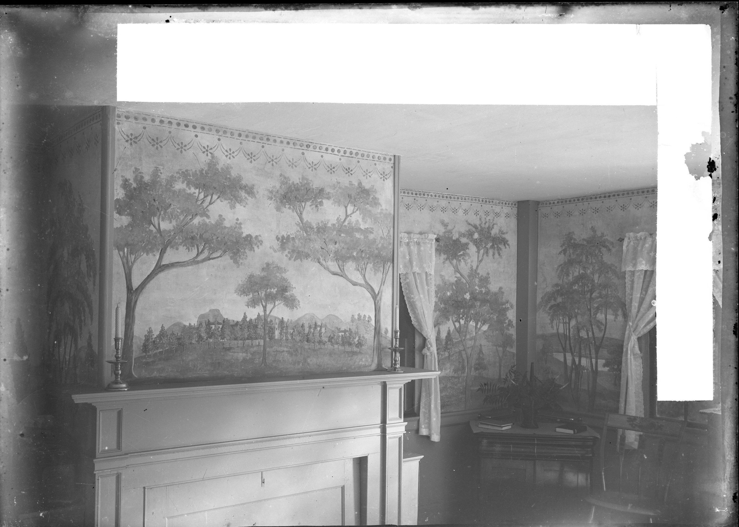 Glass plate negative photo of the interior of the Quillcote house, author Kate Douglas Wiggin's residence in Hollis, Maine. The back side of the negative has a section of a postcard pasted on. "Aug. 10, 1933 - the best neg" is written in pencil on the postcard section. The photographer Bradbury was likely sizing these photos to create postcards. The date written in pencil is likely the processing date and not the date the actual photo was taken. This image of "The Painted Room - North Wall" has appeared on postcards. Many of these postcards of Quillcote are still widely available today and sold by antique ephemera dealers. This very postcard is in the Dyer Library Archives in the "Gibeon E. Bradbury Family Papers" collection (MMS51.Ph6.1 & MMS51.Ph6.2). The wall murals in the Quillcote house are attributed to artist Rufus Porter, circa 1820.Made/Created