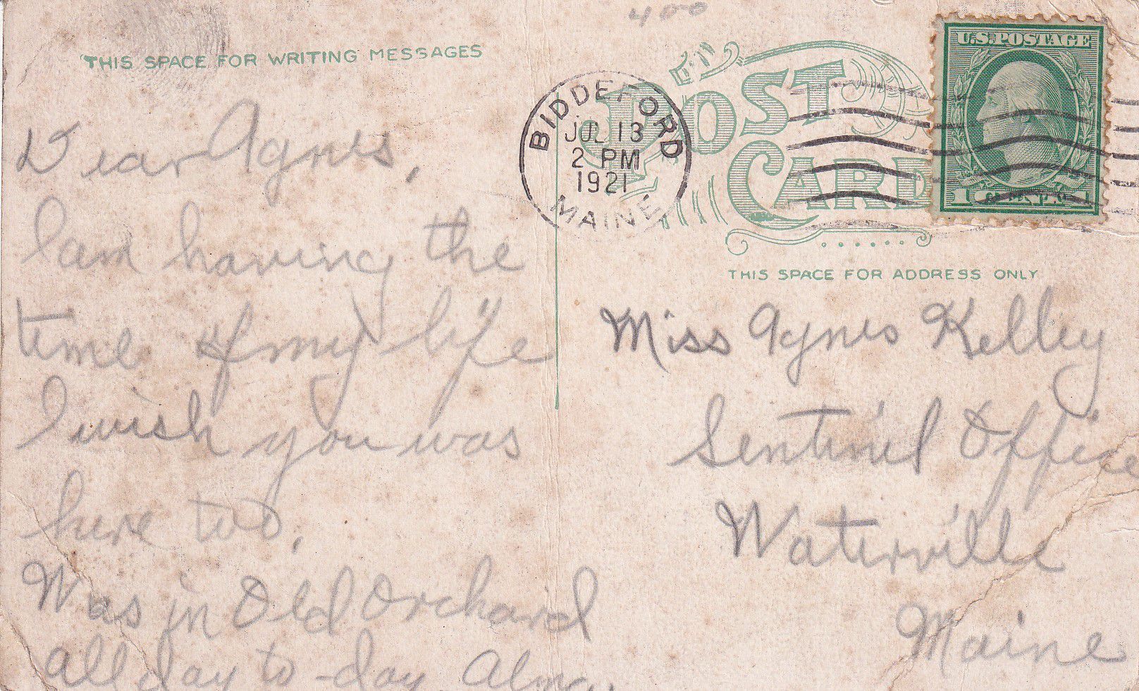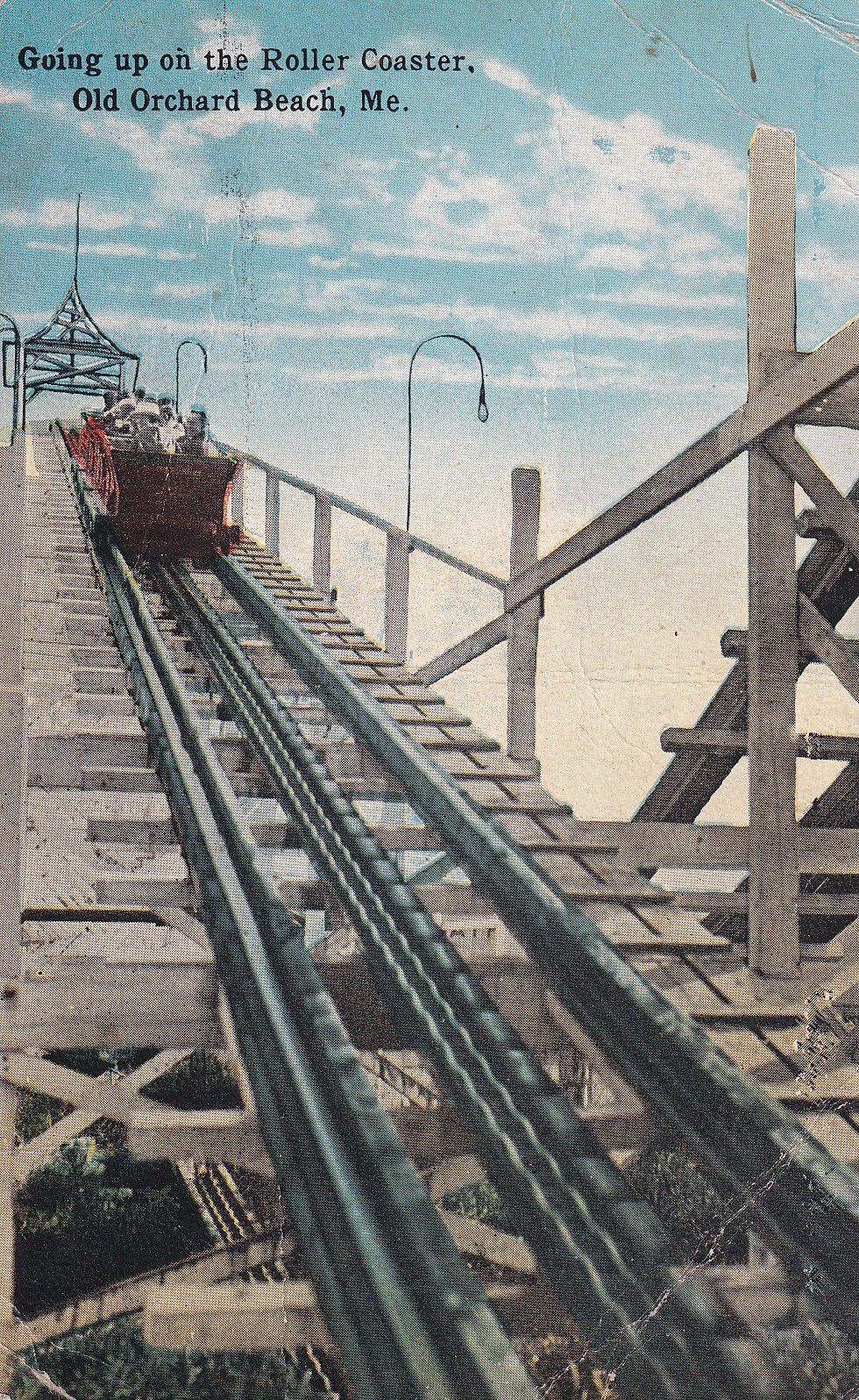 A postcard bearing a colorized image of a rollercoaster cart full of passengers going up its track.