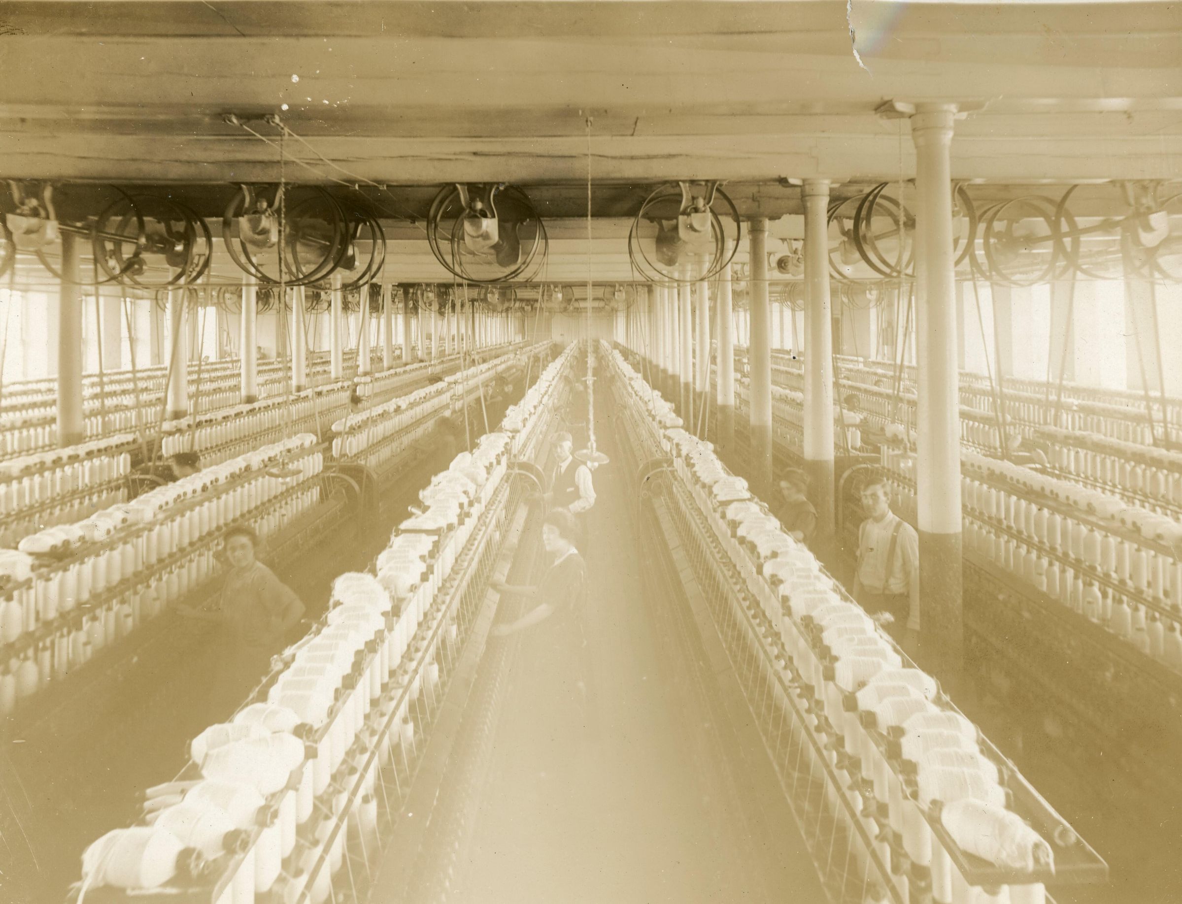 Photograph of workers in a spinning room in the Laconia Division of the Pepperell Manufacturing Company.