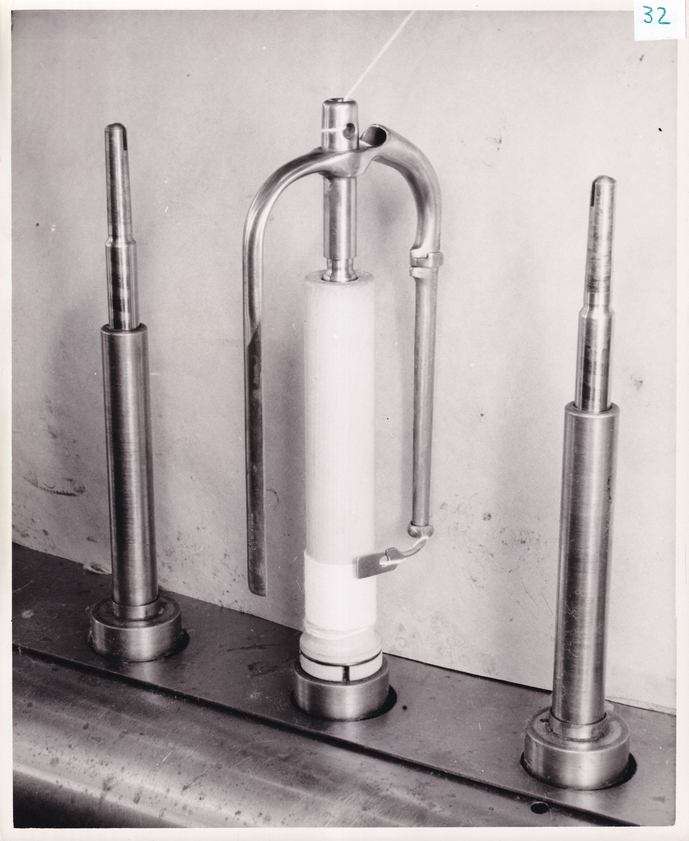 Close-up of flyers showing how the thread wound through the flyer and onto the bobbins. By adjusting the speed of the bobbin to a different speed than that of the flyer, the engineers and operators could effect the twist to make the thread strong enough for the next step in the process.Made/Created