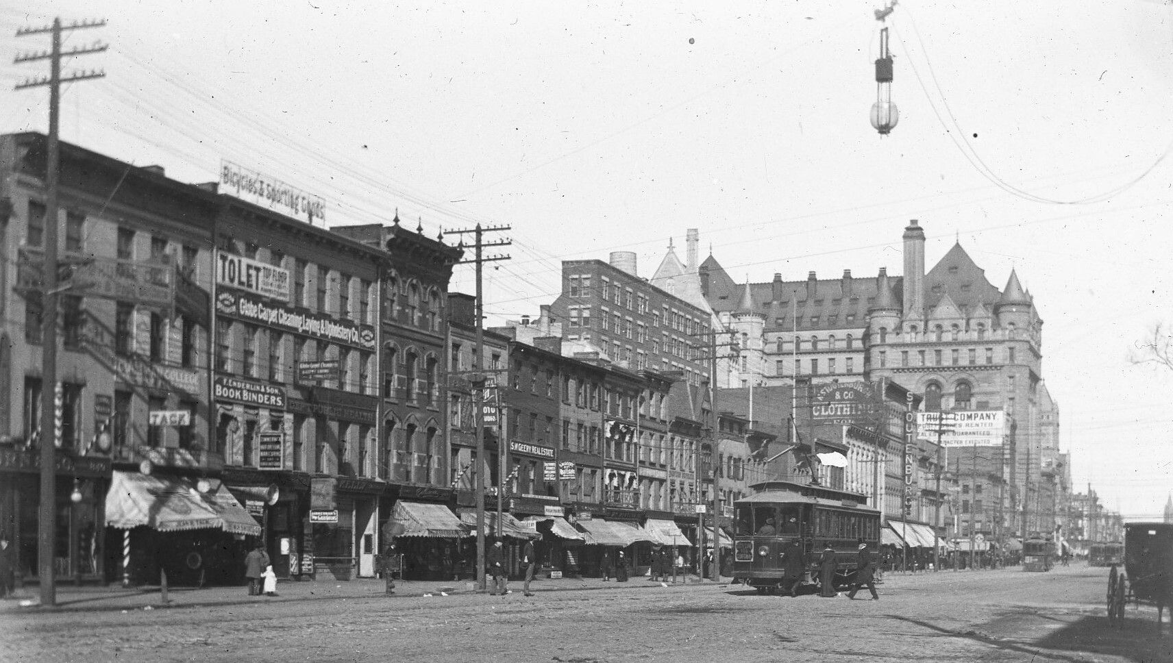 Glass lantern slide of a street in Newark, New Jersey. The original Prudential building can be seen in the distance. "Looking up from CRR [Central Railroad] Depot" is written on the label on the slide.