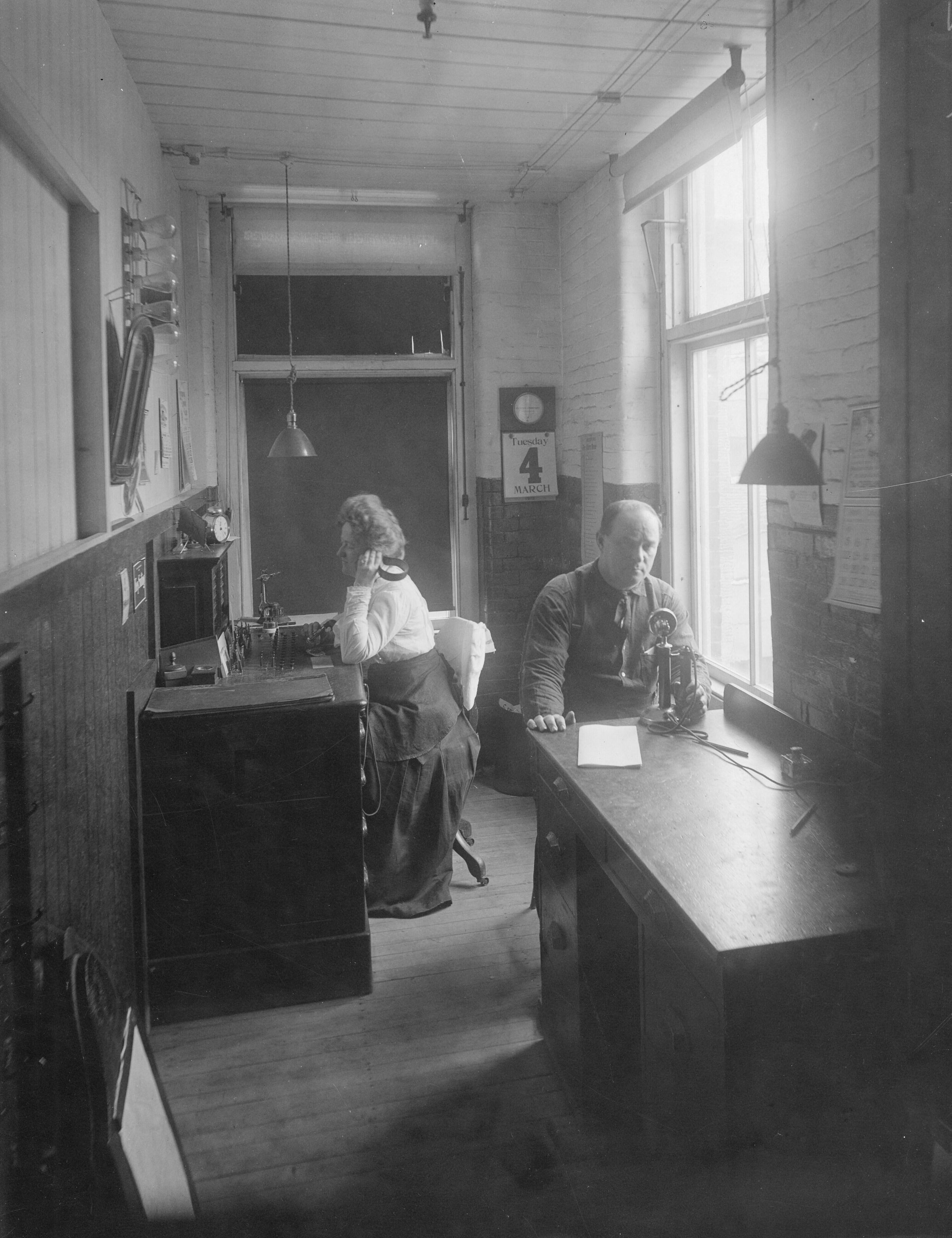 Photograph of office interior in the Laconia Mills Division of the Pepperell Manufacturing Company. A woman runs the switchboard while a man sits near a telephone. The date on the calendar says March 4th, 1913.