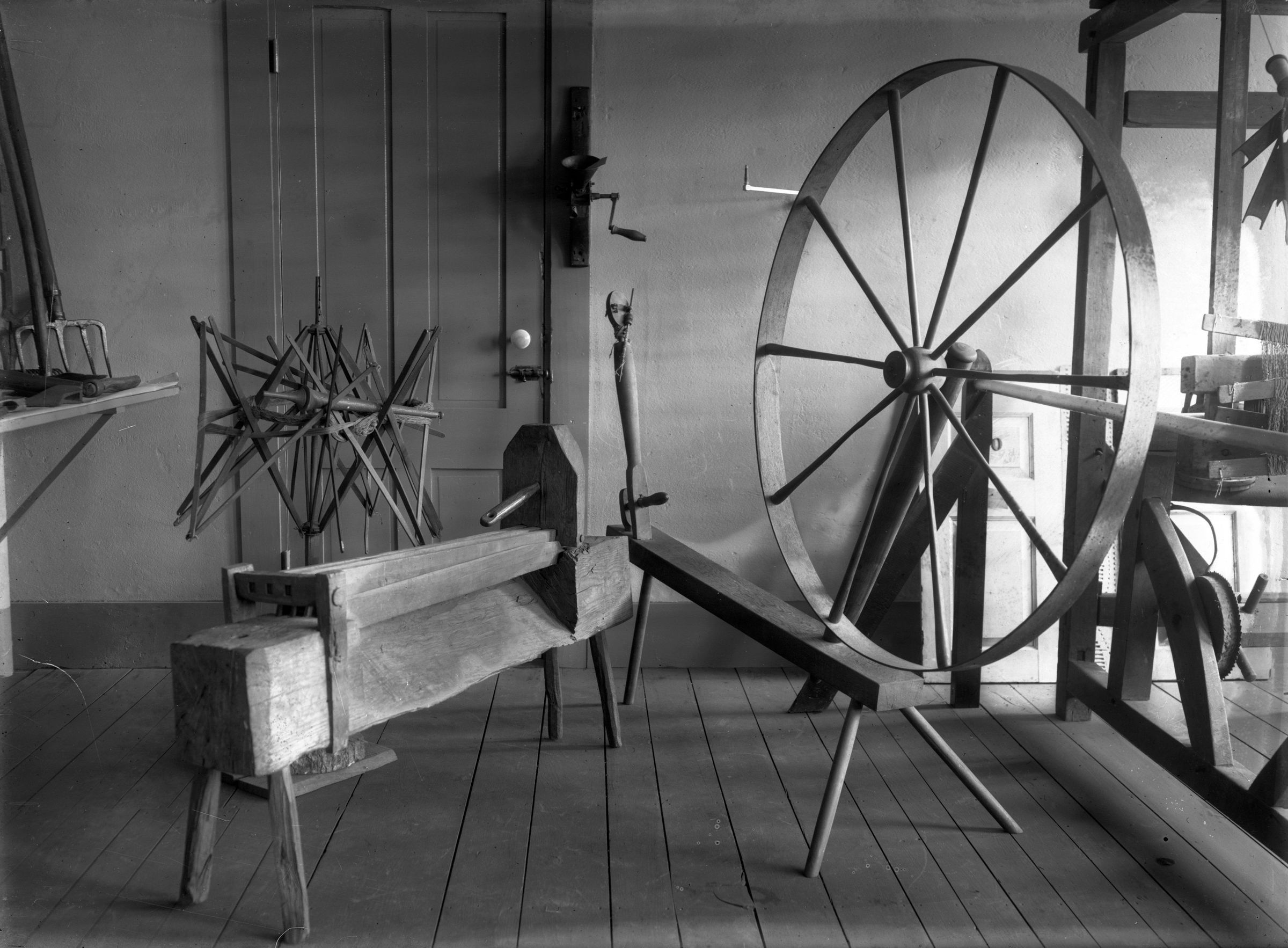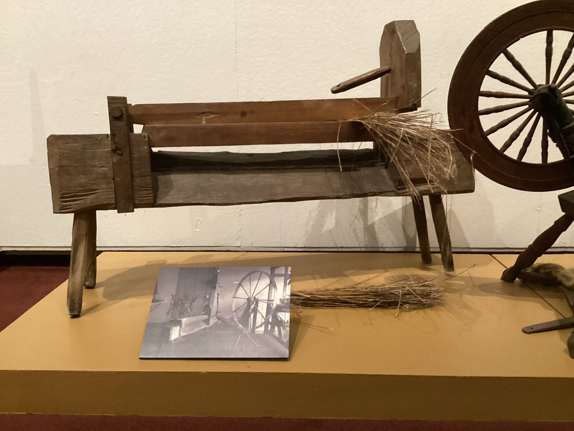 Flax brakes were used to separate the pulpy core of the flax plant from the surrounding fibers. The flax was draped over the base of the brake and struck sharply from above by the top set of boards, gradually shifting the flax along its length until all of the core and bark had broken.