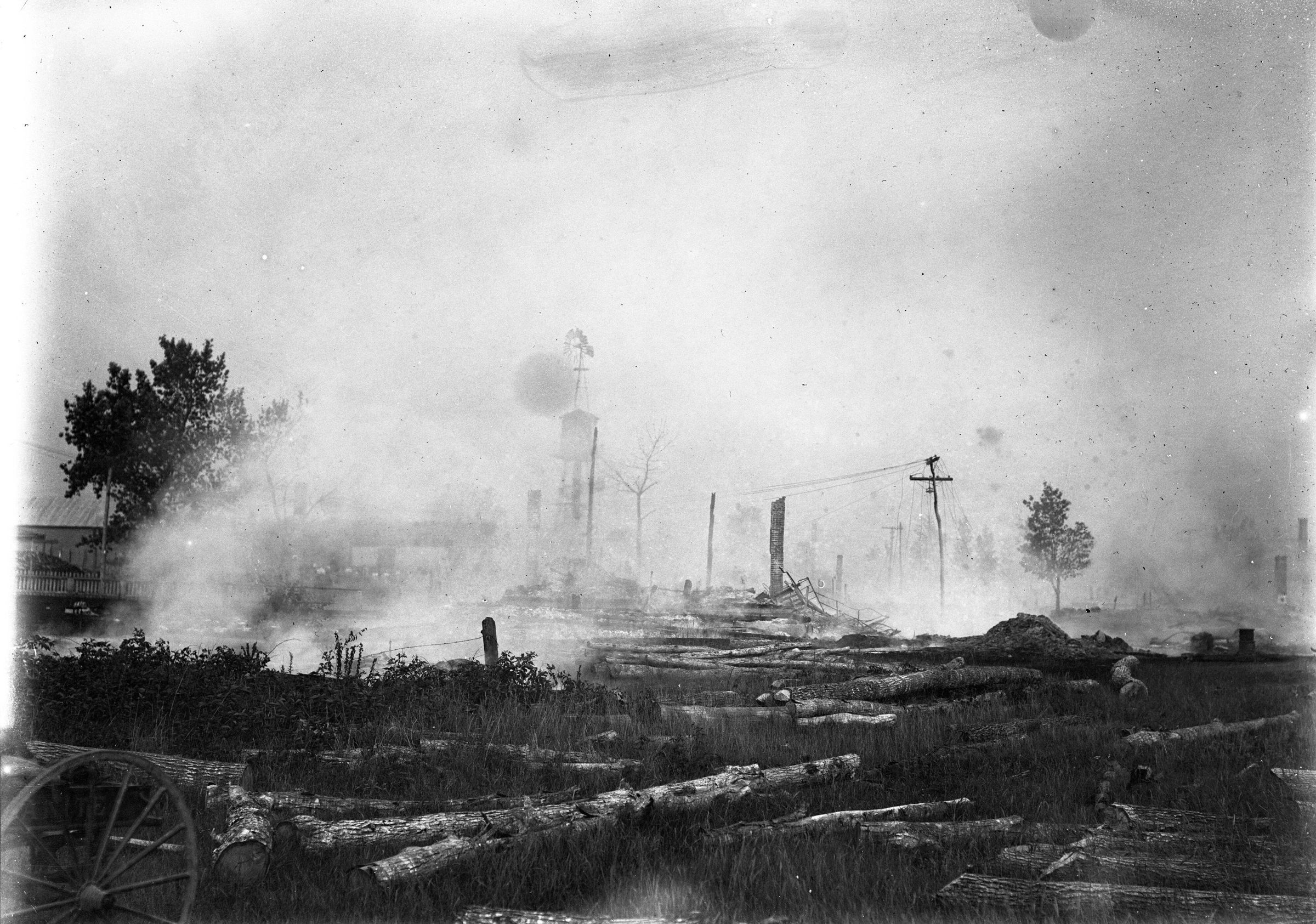 Glass plate negative photo of the smoldering aftermath of the Somesville fire. The Somesville fire in Saco occurred on September 15, 1908.