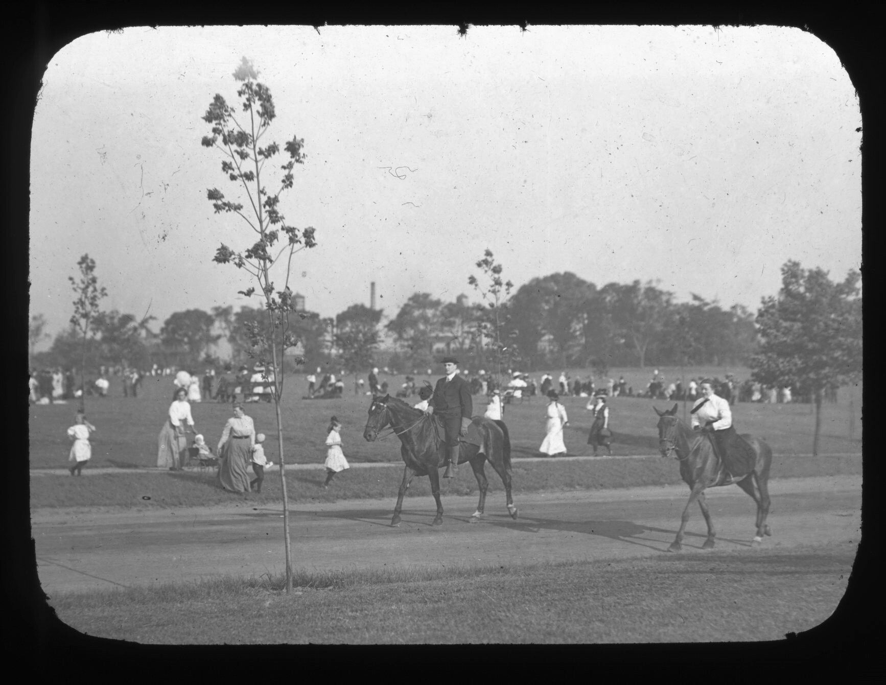 Glass lantern slide of horse riders at a park. Likely Weequahic Park in Newark, New Jersey.