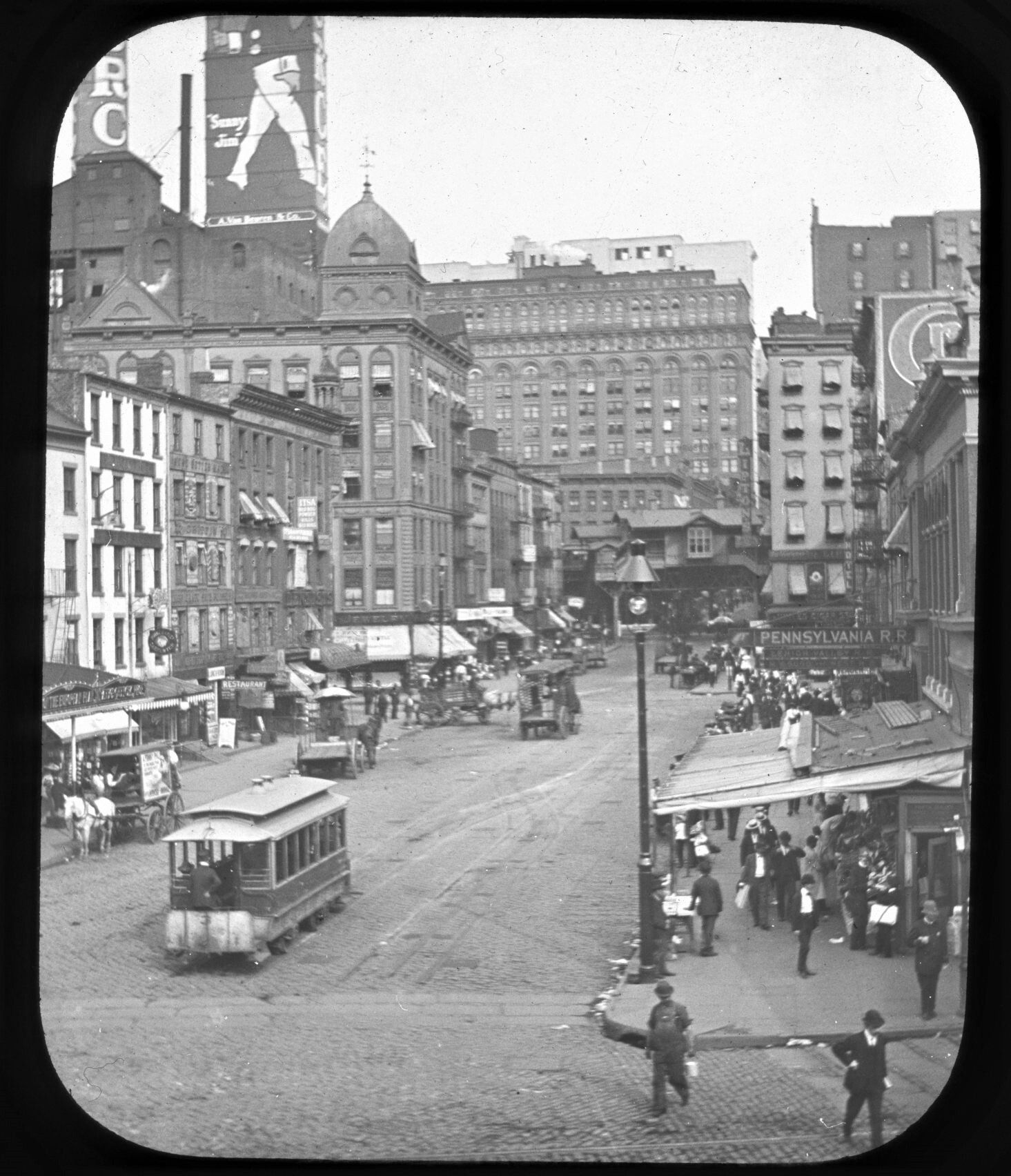 Glass lantern slide of a Cortlandt Street in New York, New York. "Courtland [sic.] St., NY City" is written on the label on the slide.