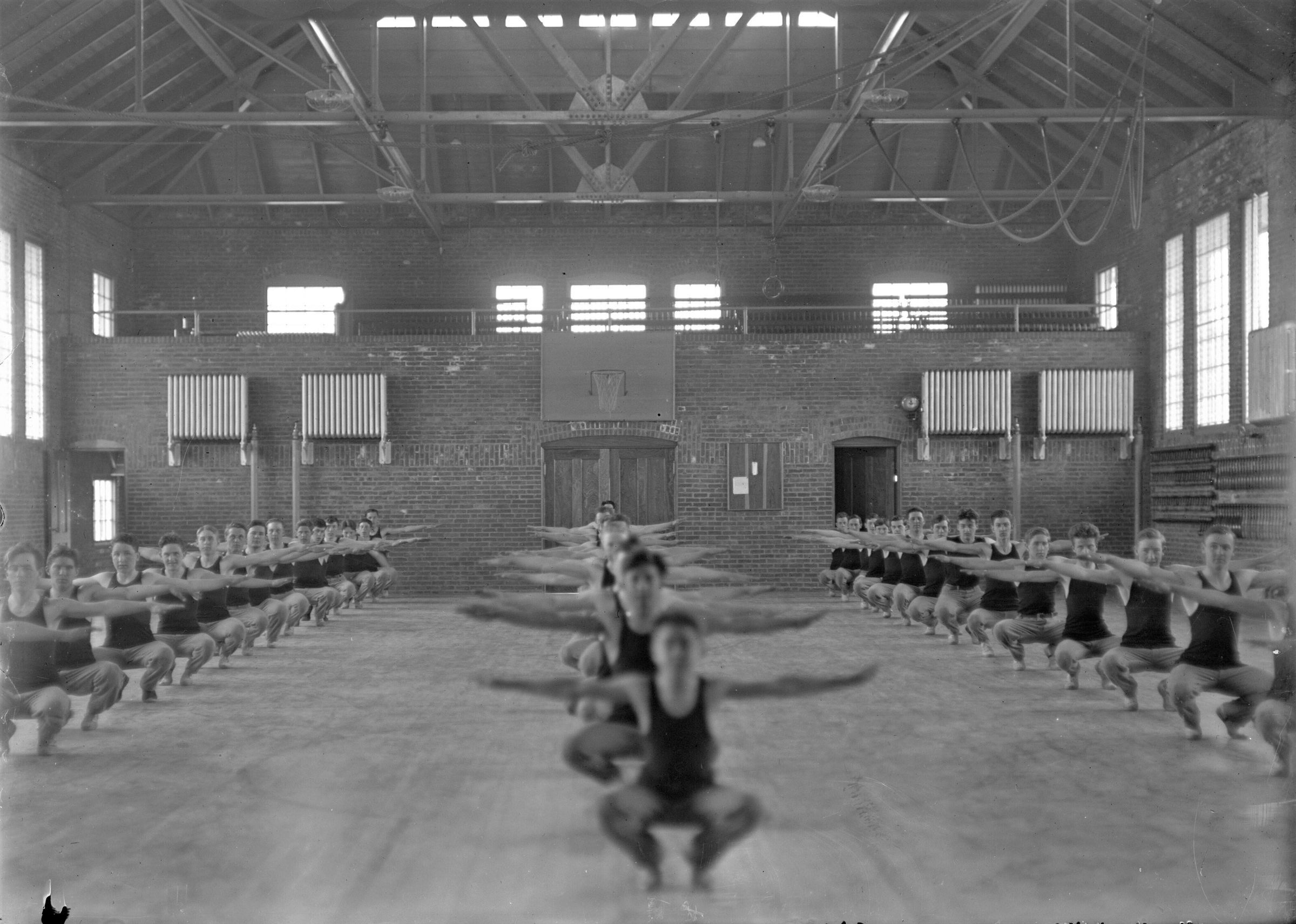 Glass plate negative photo of a group of boys in gym class at Thornton Academy. This is in the original George Addison Emery Gymnasium which was built in 1913. Today the building houses the school library.