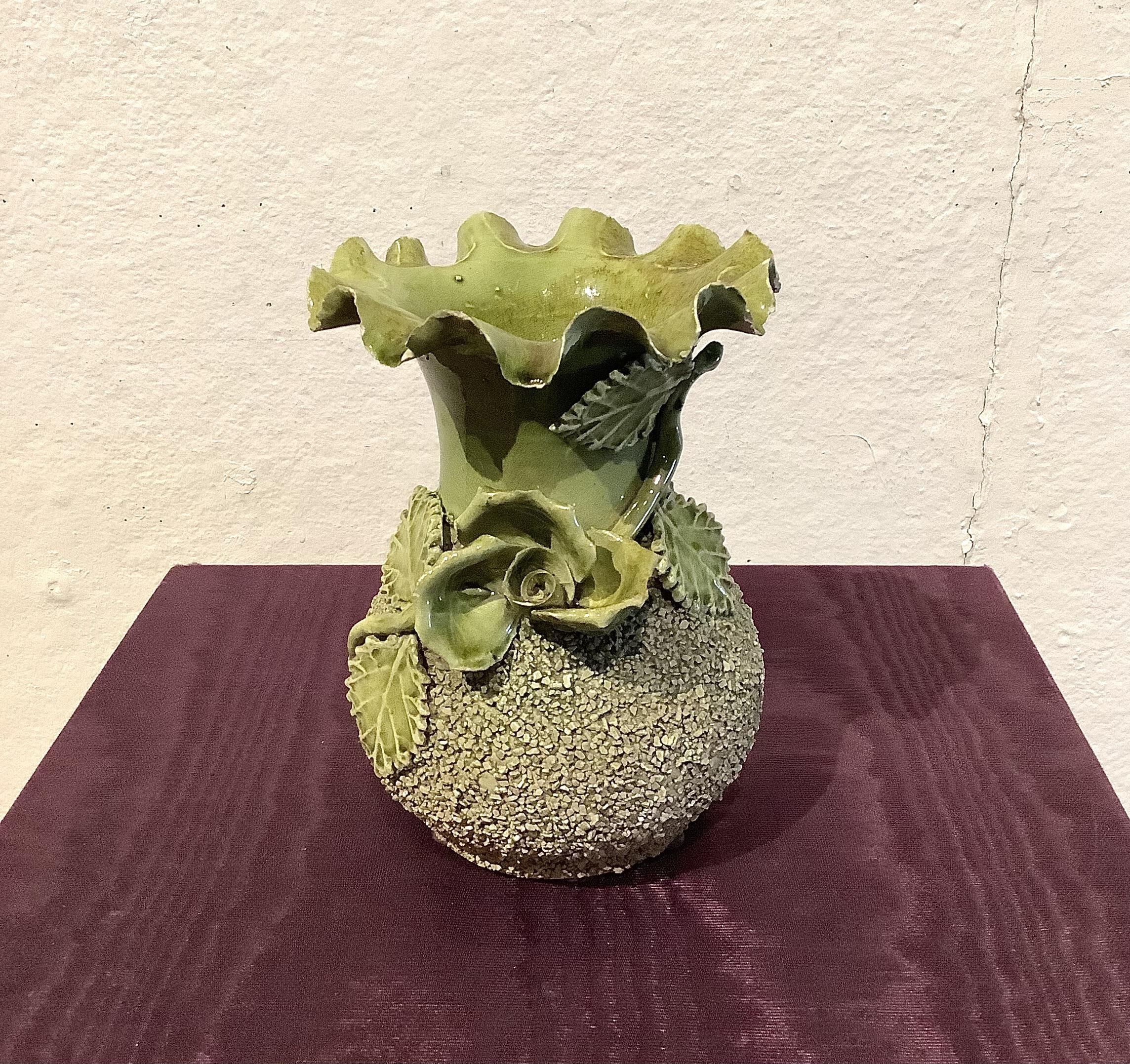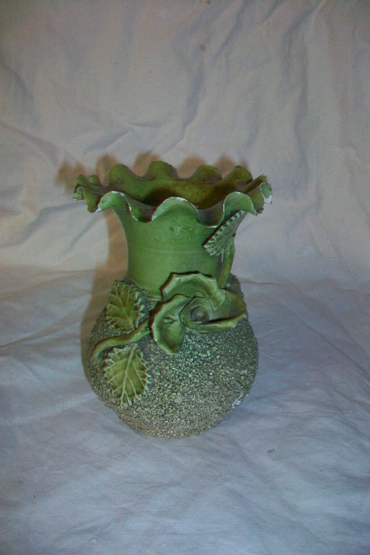 Small pea-green sanded majolica vase with fluted rim, cylindrical neck, sloping shoulder to swelled lower body, and round foot. Overall green glaze with some brown shadowing. The body of the vase is "sanded," glazed and rolled or dipped in small shredded pieces of prefired unglazed clay creating the distinctive decorative texture. The sanded area has a grayish cast. A molded naturalistic rose blossom on a branch with two leaves below the blossom and two above is applied to the front of the vase from the lower left side of the body and terminates at the upper right just below the fluted rim. Unmarked.Dimensions