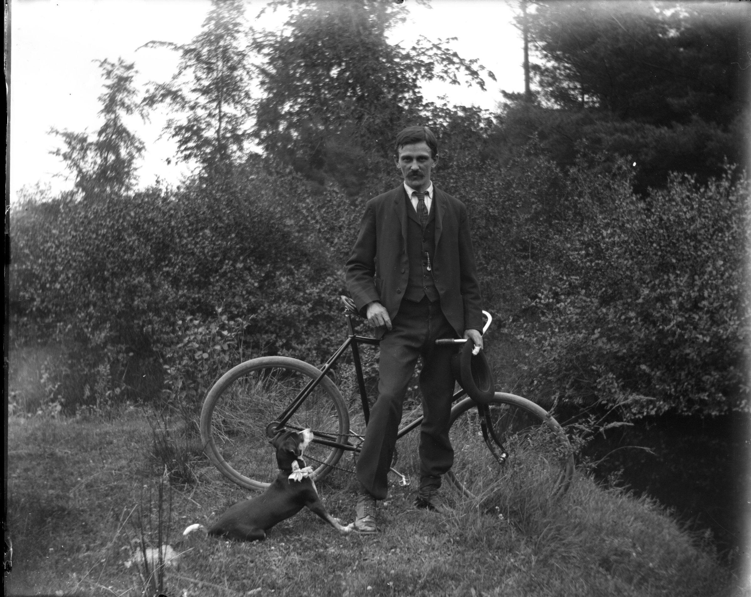 Glass plate negative photo of Rufus Milton Hobbs self-portrait with bicycle and dog. Circa 1904.