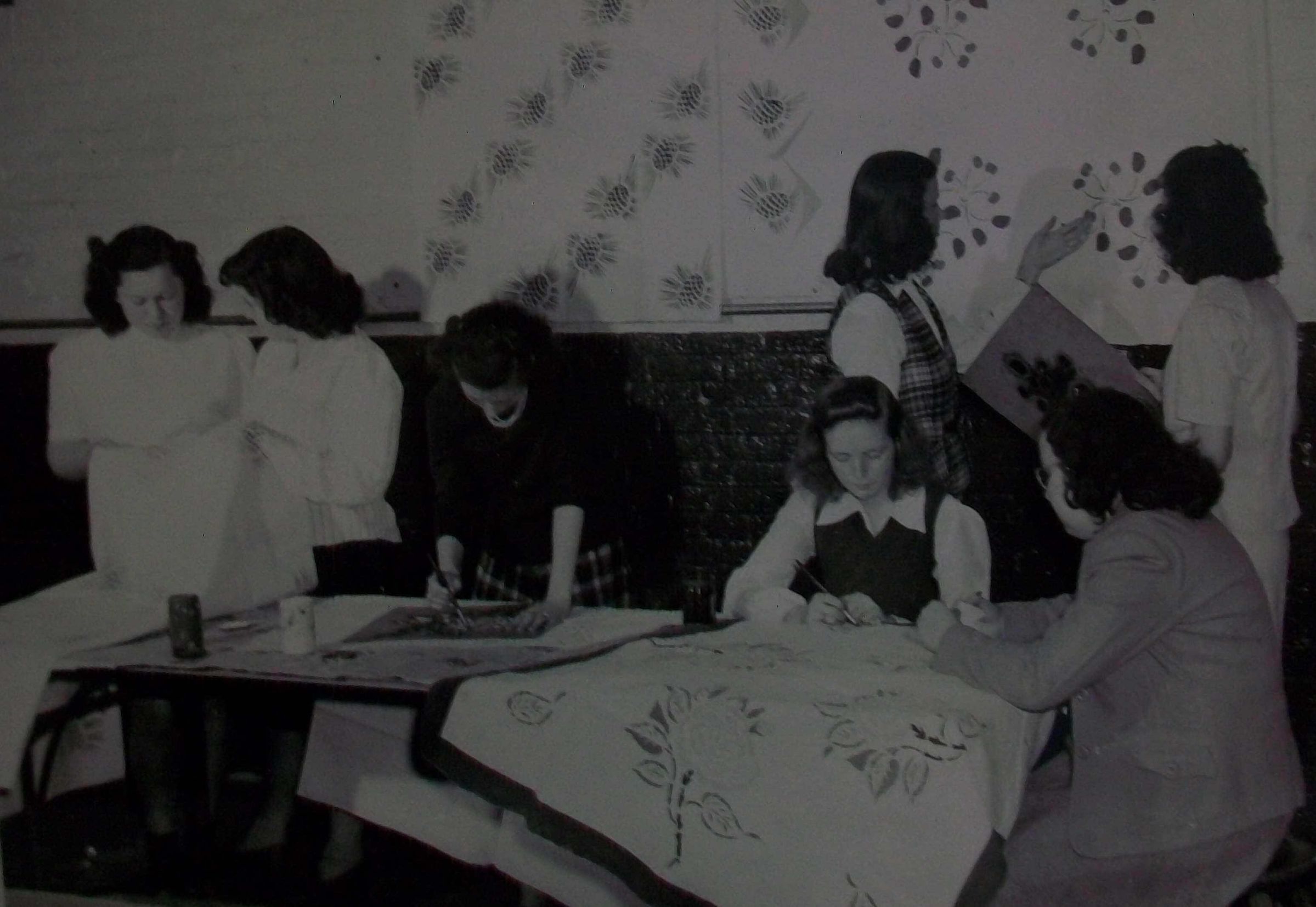Picture of seven women stenciling sheet fabric. Pictured: Standing - Haraldine Whitehead, Elaine Butler, Grace Thompson, Rebecca Grace, Paula Bennett Seated - Isabelle Treadwell, Helen Clegg The sheet being stenciled in the photograph or a similar sheet is in the collection object #2009.59.22