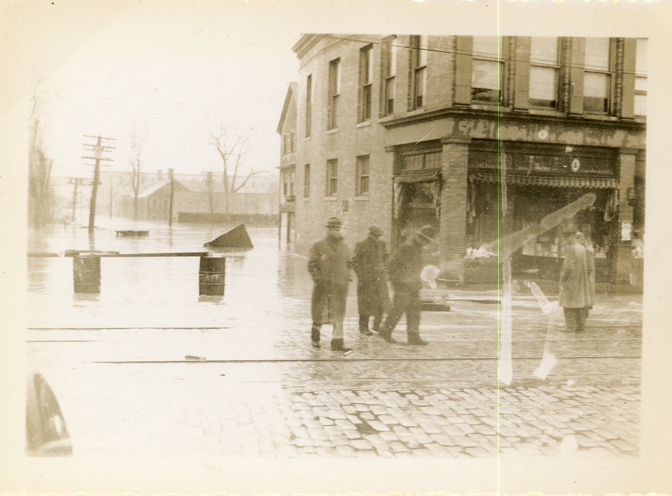 Black and white print photograph of Saco River flooding in Saco, Maine depicting road blockade and people walking in the street (possibly Main Street). From the Sawyer House Collection.Dimensions