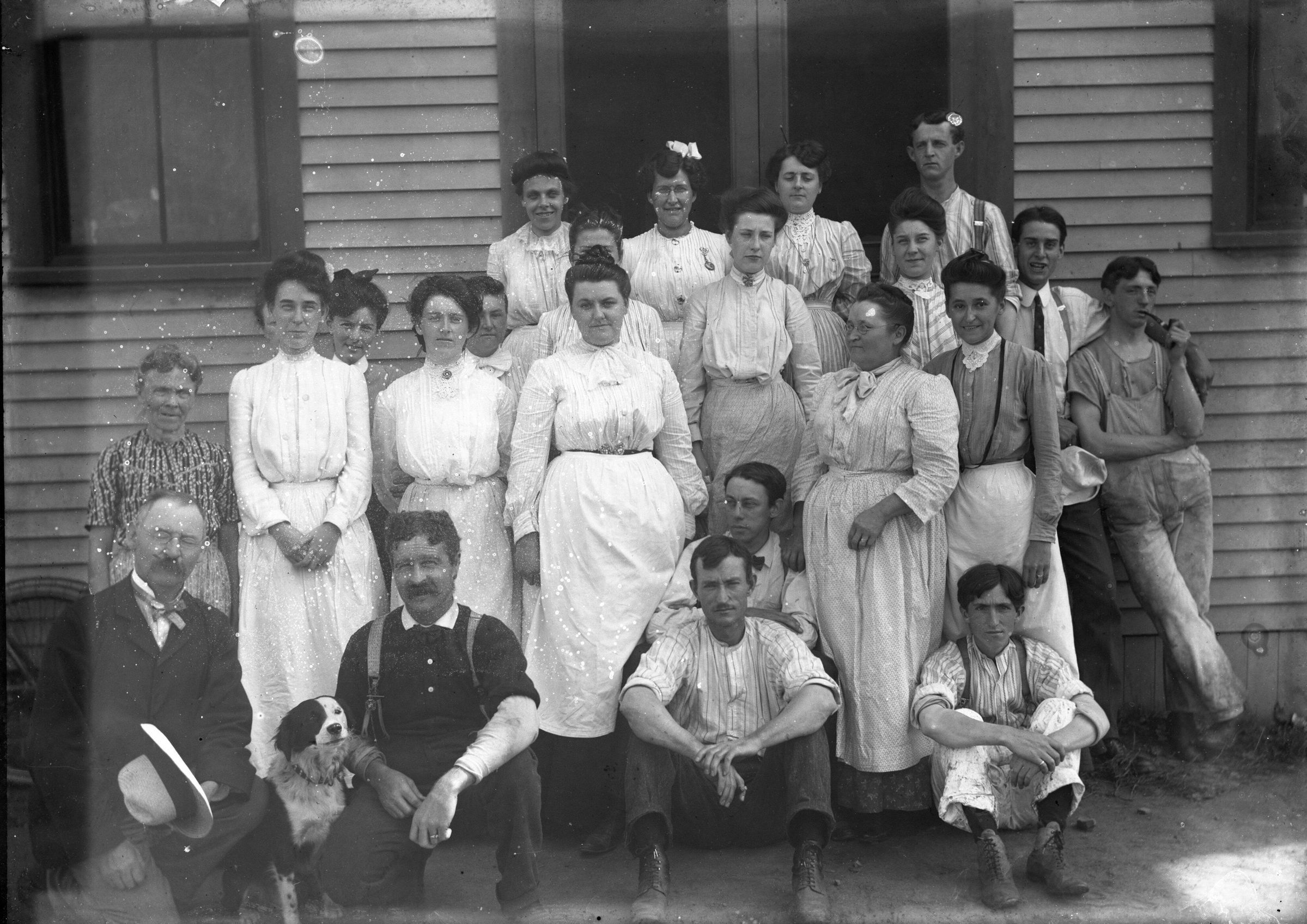 Glass plate negative photo of a large group of adults posed outside a house (same group as 2010.46.42).