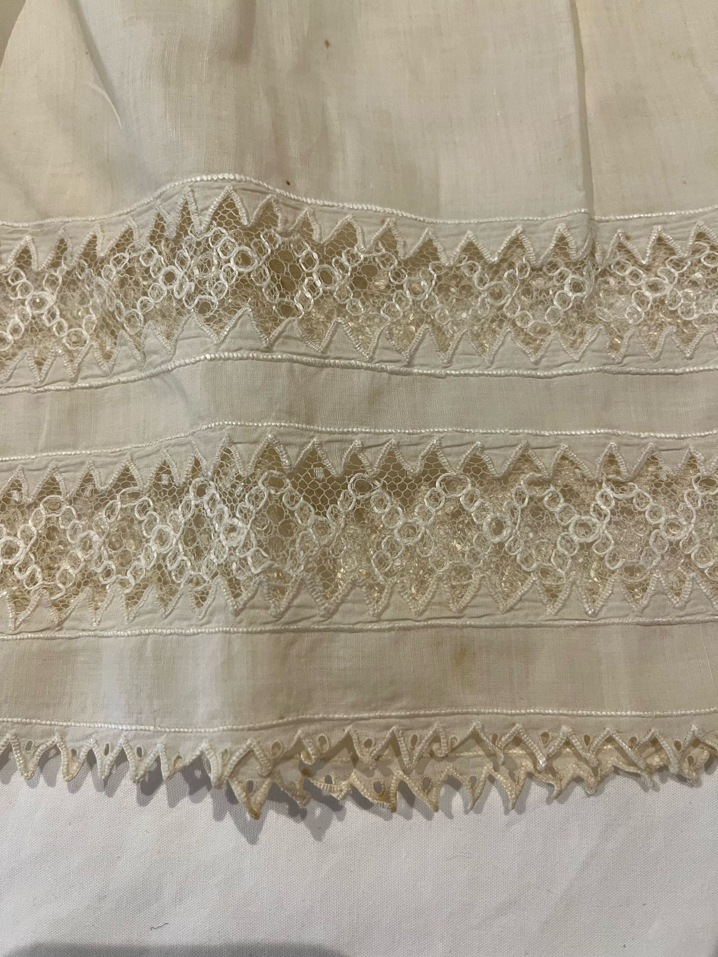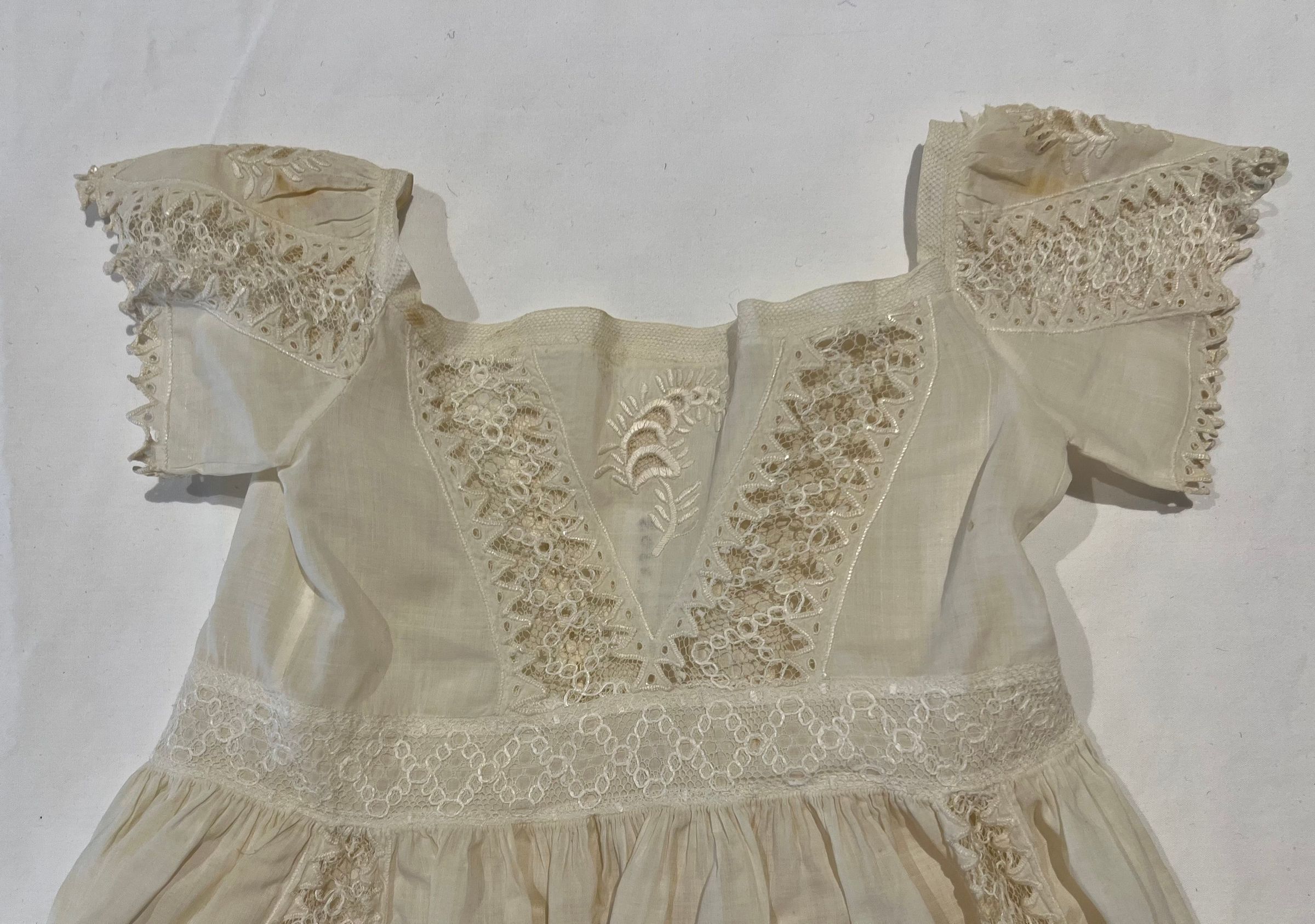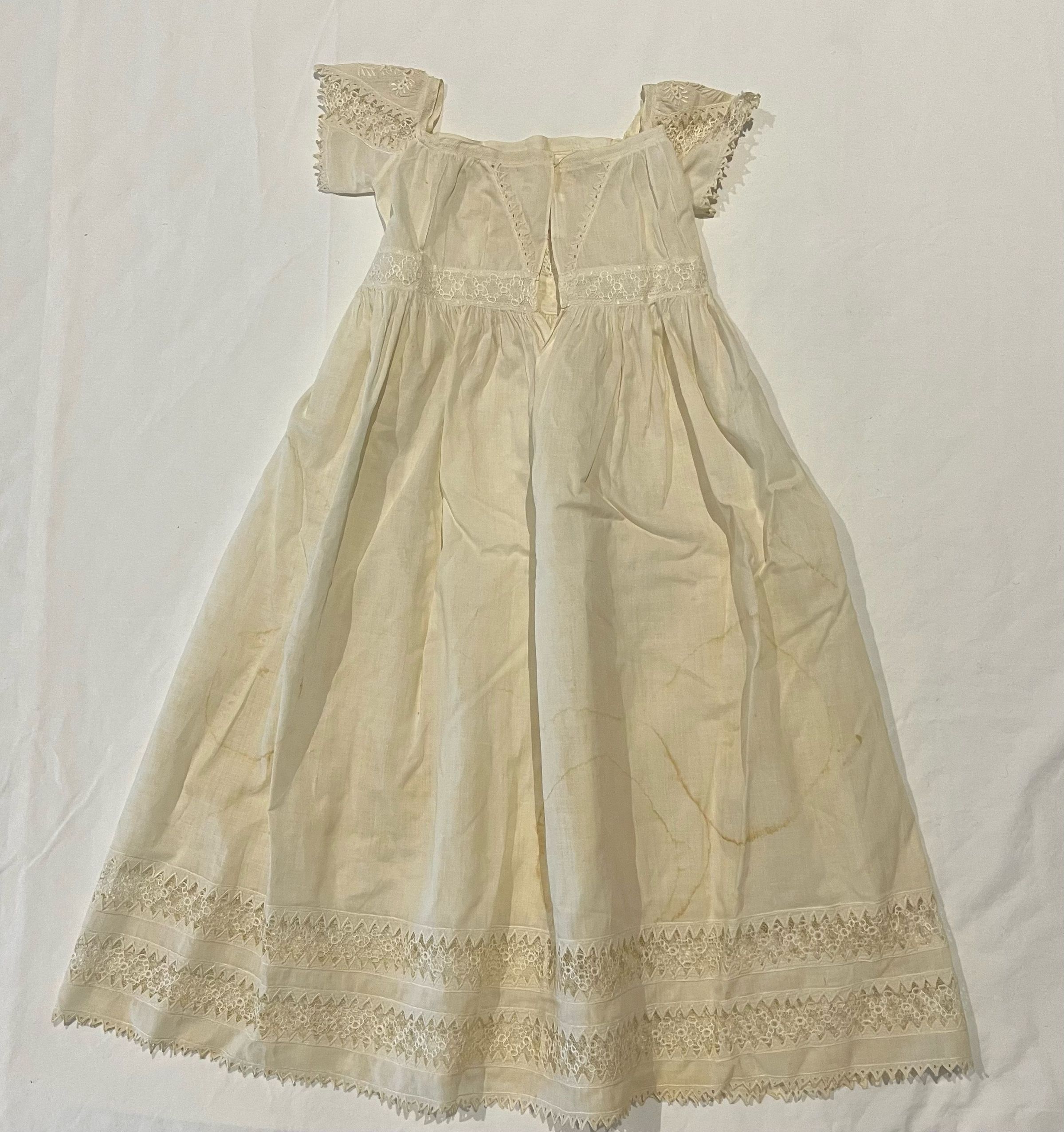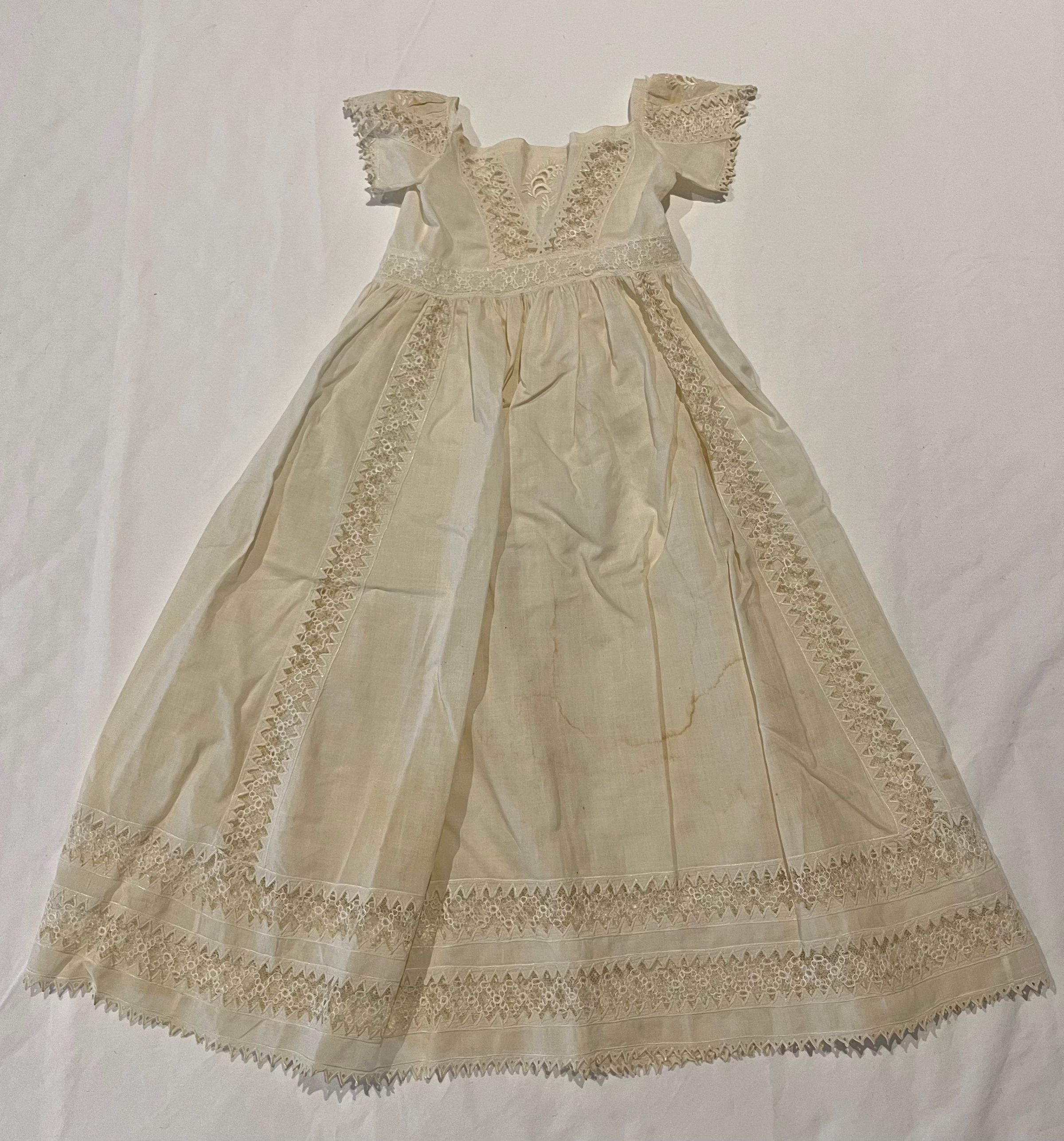 Cotton christening dress with net lace and vandyke trim. Wide square neck and short sleeves. The two bands of trim on the bodice and the sleeves flank an embroidered floral motif. All of the net lace trim is the same except that on the waistband, which lacks the vandyke edging. Two vertical bands of trim on the outside edges of the front of the skirt. Two rows of the same trim above the hem with a narrow band of plain cotton in between. The hems of the skirt is trimmed with vandykes, as are the sleeves. Opens at the back with no signs of closures.