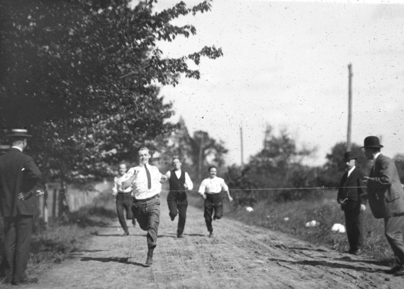 Glass lantern slide of Essex Camera Club members in a footrace. "Active Members" is written on an "Essex Camera Club, Newark NJ" slide label. (see also 2022.61.231)