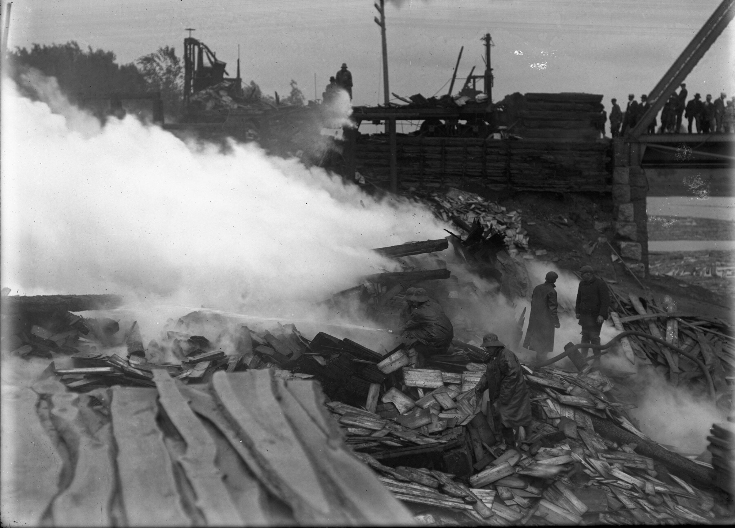 Glass plate negative photo of firefighters on top of the rubble of the Harmon's Corner (Main and Elm Street) fire in Biddeford. The Harmon's Corner fire in Biddeford occurred on July 8, 1911.