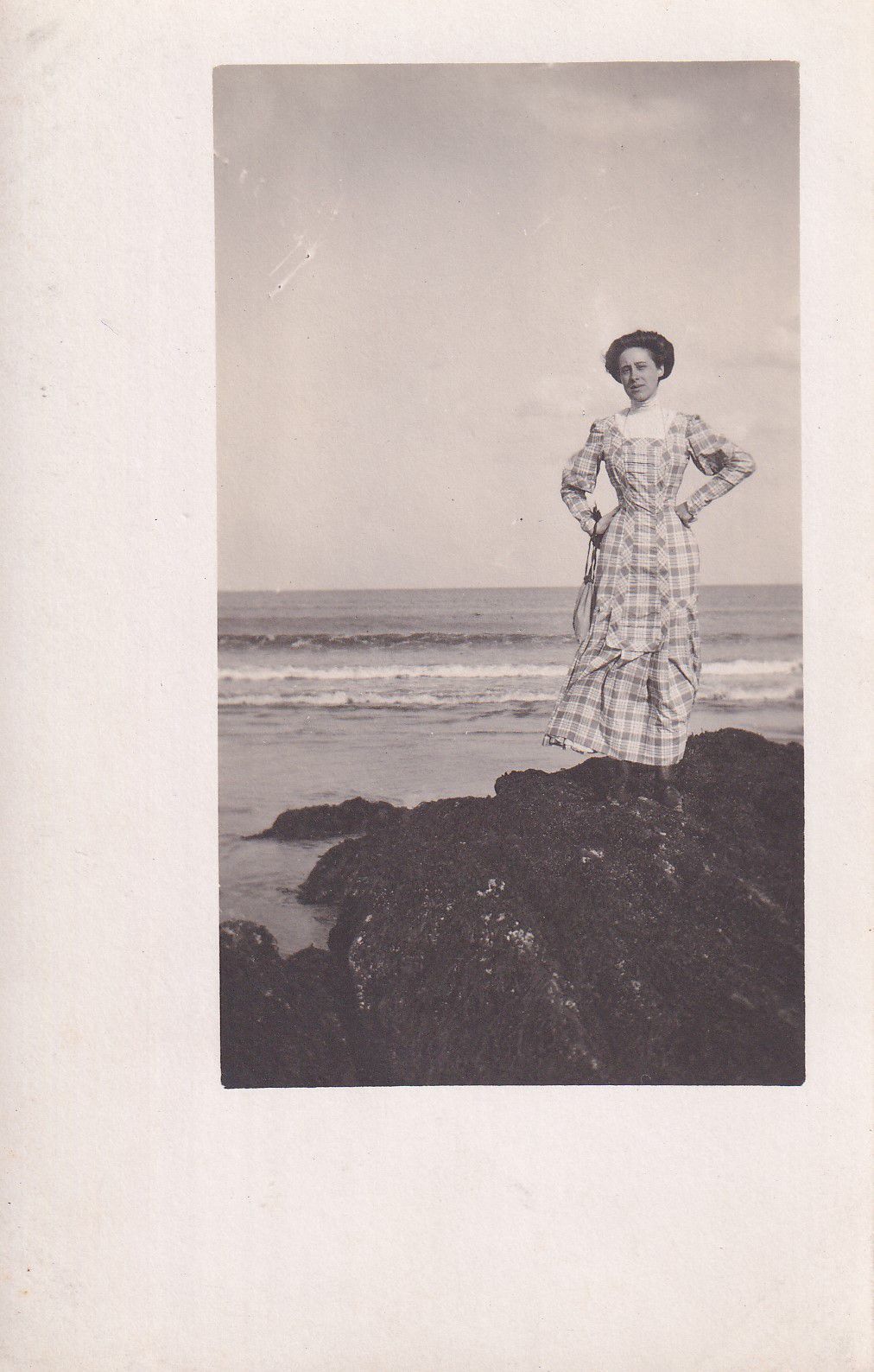 A postcard bearing a black and white photograph of a woman standing on rocks with the ocean in the background.