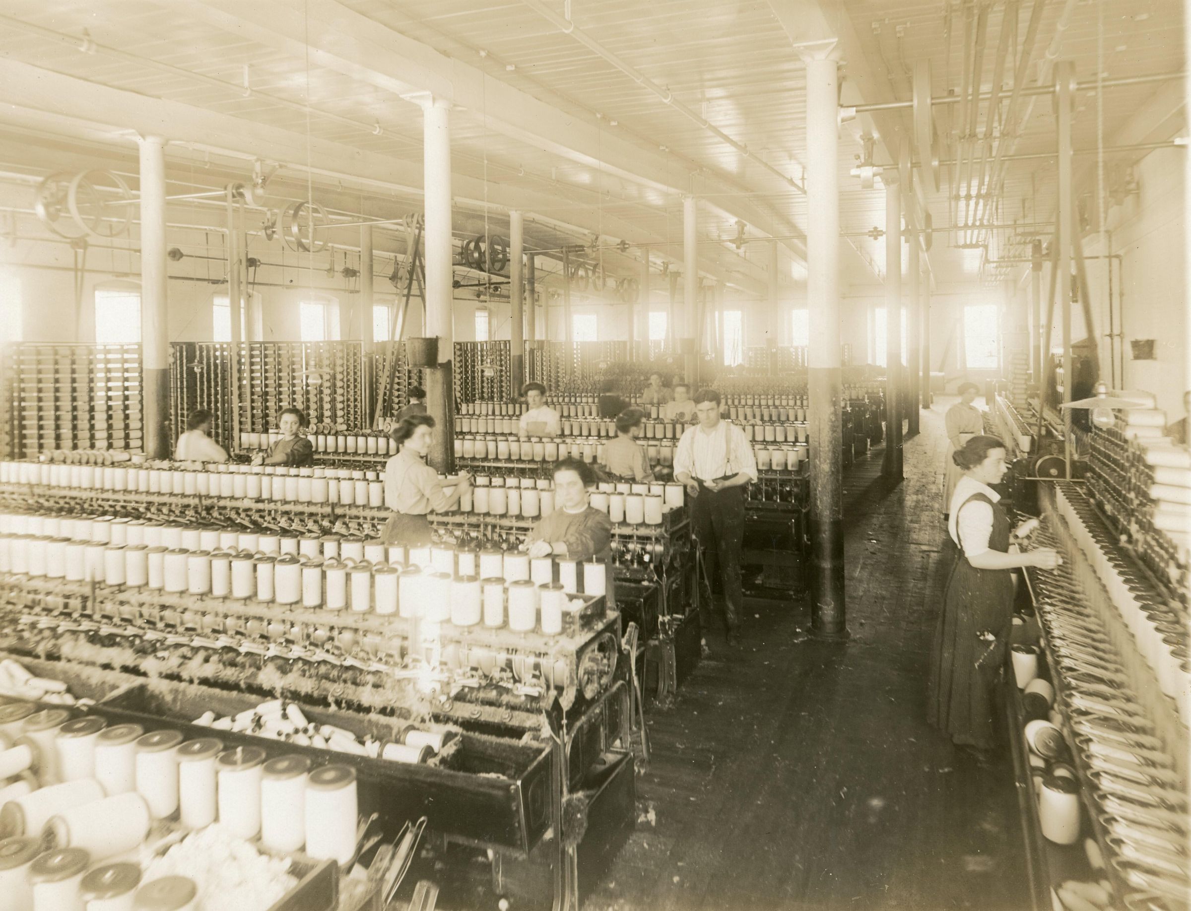 Photograph of workers in a spooling room in the Laconia Division of the Pepperell Manufacturing Company. The creels for the warpers can be seen along the windows on the left side of the photograph.