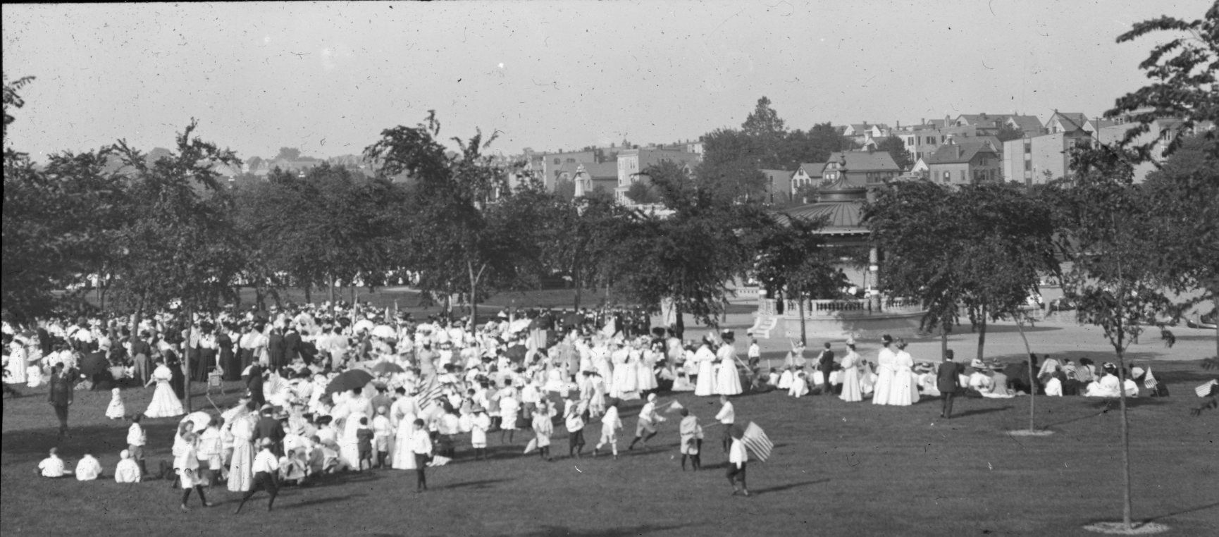 Glass lantern slide of a large group of people dressed in white at a park. "Branch Brook Sunday School Gathering" is written on an "Essex Camera Club, Newark, NJ" slide label.