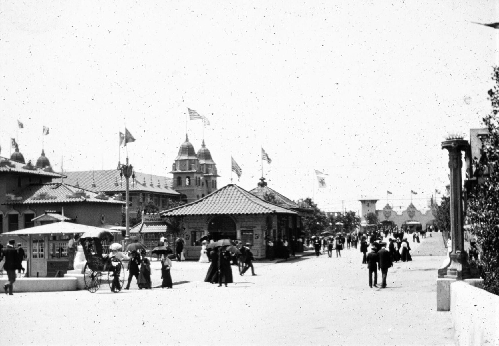 Glass lantern slide photo of the Pan-American Exhibition, Buffalo, NY 1901. This photo depicts the Pan-American Exhibition that took place in Buffalo, NY in 1901. In the foreground of the photo there is a sign for an "Infant Incubators" exhibit, a medical curiosity for the public. Many boardwalks and amusement parks had such exhibits--the most famous being housed in Coney Island's Dreamland--where premature babies were cared for in the cutting edge of baby technology: the incubator. Prior to its invention, premature babies would rarely live past birth; the babies held in the exhibits, however, had a chance of surviving to adulthood thanks to the team of nurses and the incubators they oversaw.