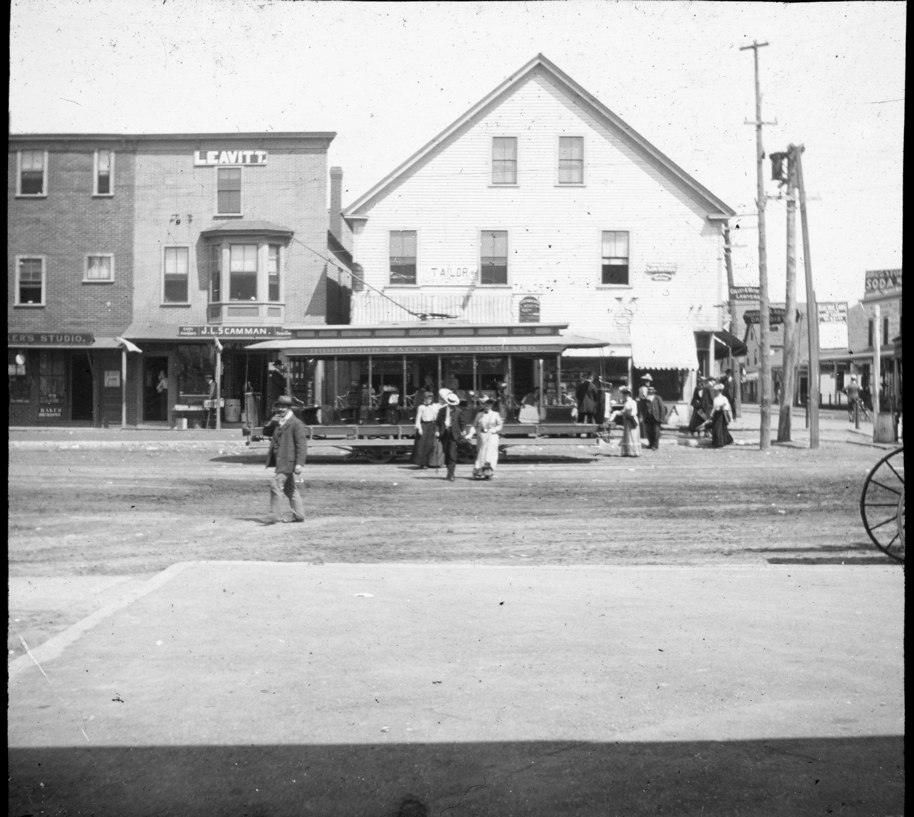 Glass lantern slide of a trolley at Old Orchard Beach, with several businesses in the background. "At Old Orchard Beach" is written on the slide label.