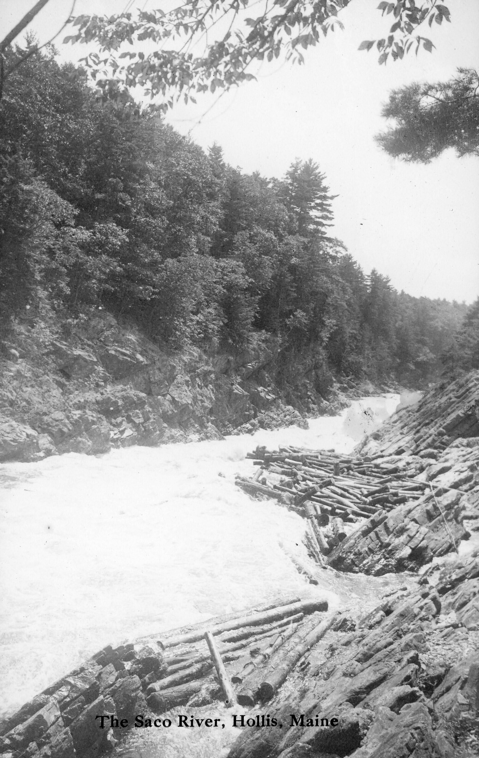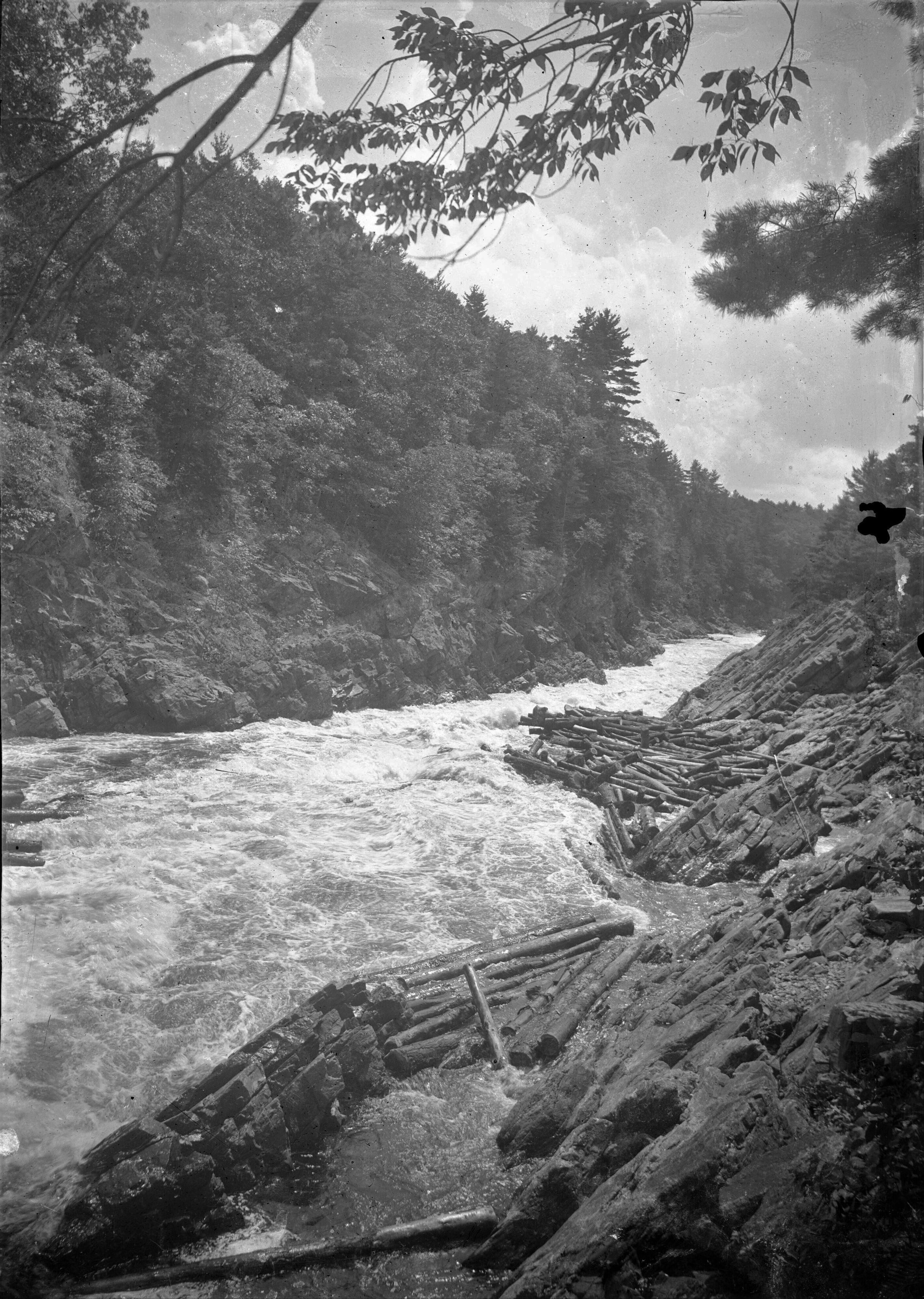 Glass plate negative photo of a man logs on the Saco River, likely in the Buxton-Hollis area. The same postcard is in the Dyer Library archives "Gibeon E. Bradbury Family Papers" collection (MMS51.Ph33).Made/Created