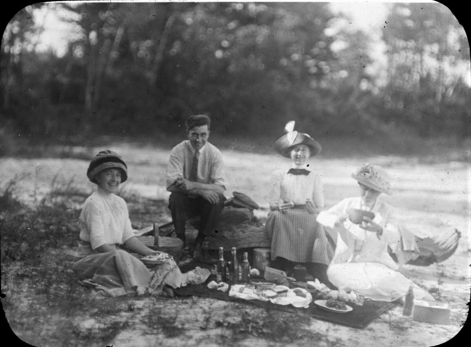 Glass lantern slide photo of (from left to right) Vivian Lois Cole (1890-1969), Howard Sawyer (1887-1935), Ella Winifred Cole Sawyer (1887-1967), and unidentified woman. The Coles and Sawyers were regular subjects in Moody's photos.