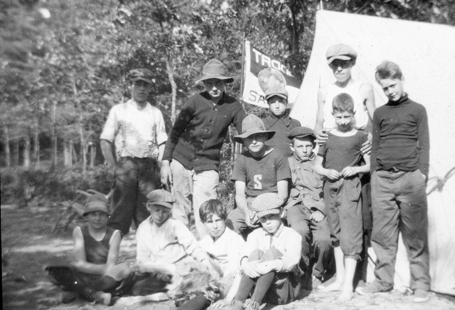 Glass lantern slide of Saco Boy Scouts. An earlier entry says "the boy in the cap is Charles Frederick Moody" but this has not been verified.