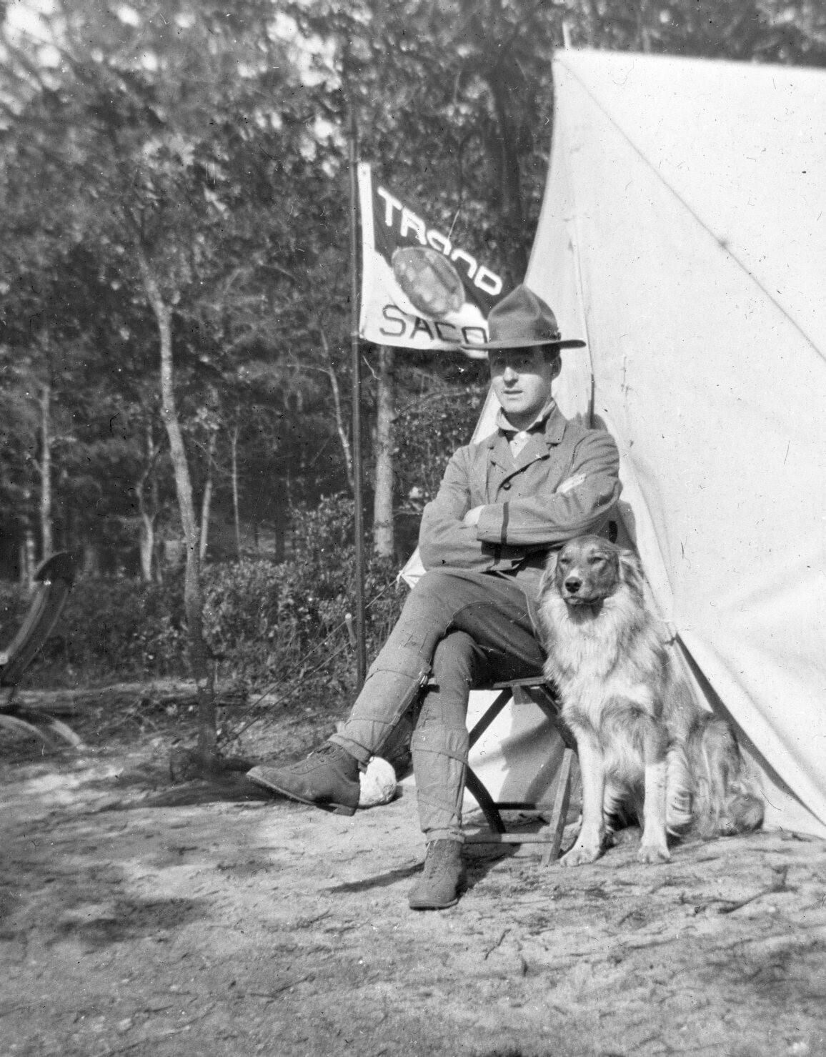 Glass lantern slide of a Saco Boy Scout troop leader seated outside tent with dog.