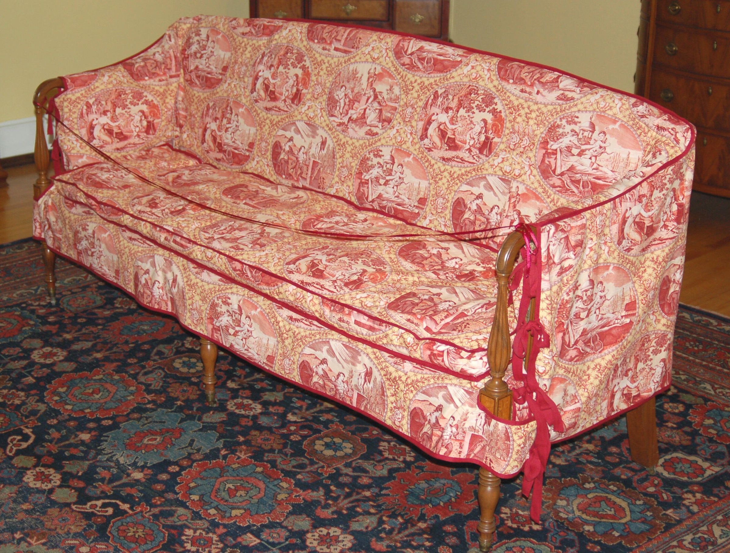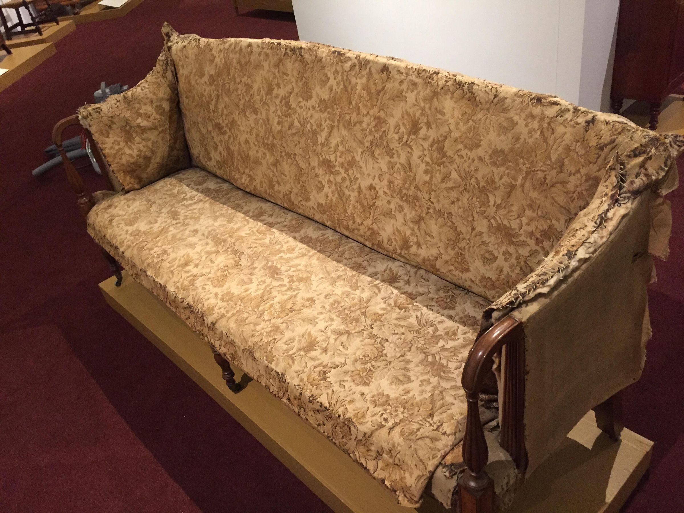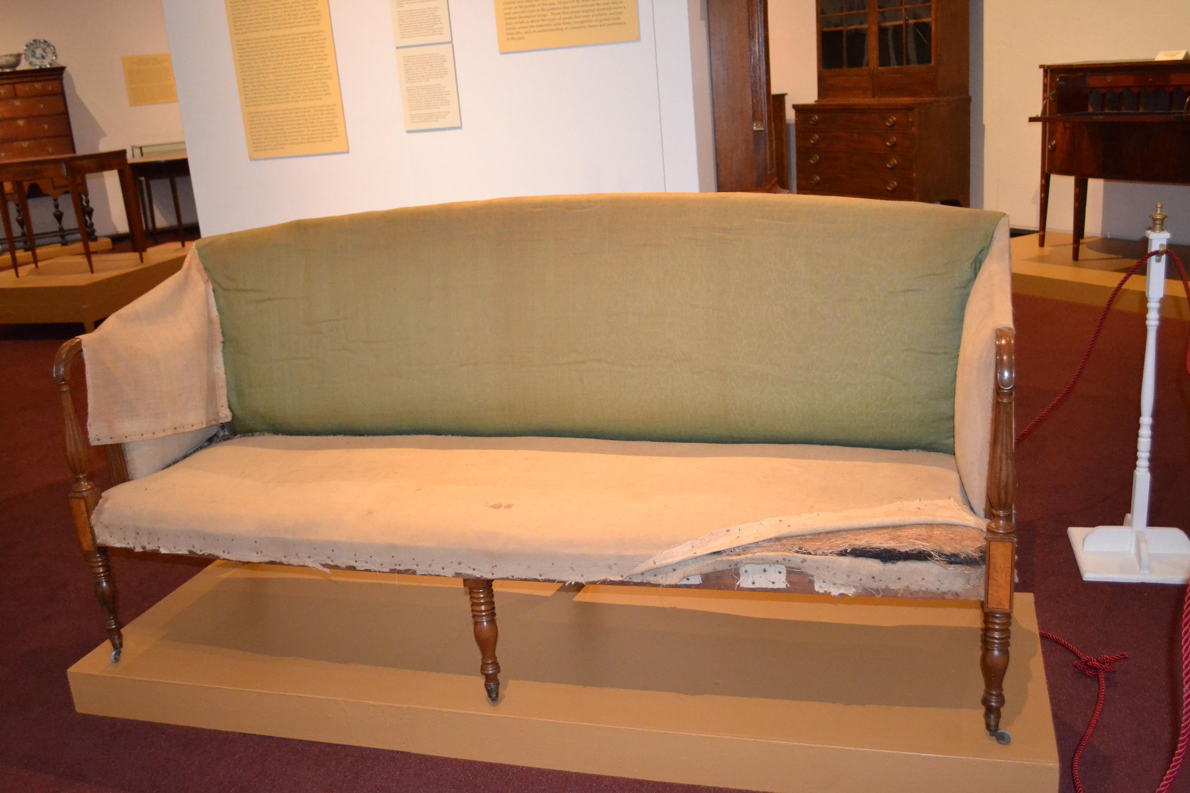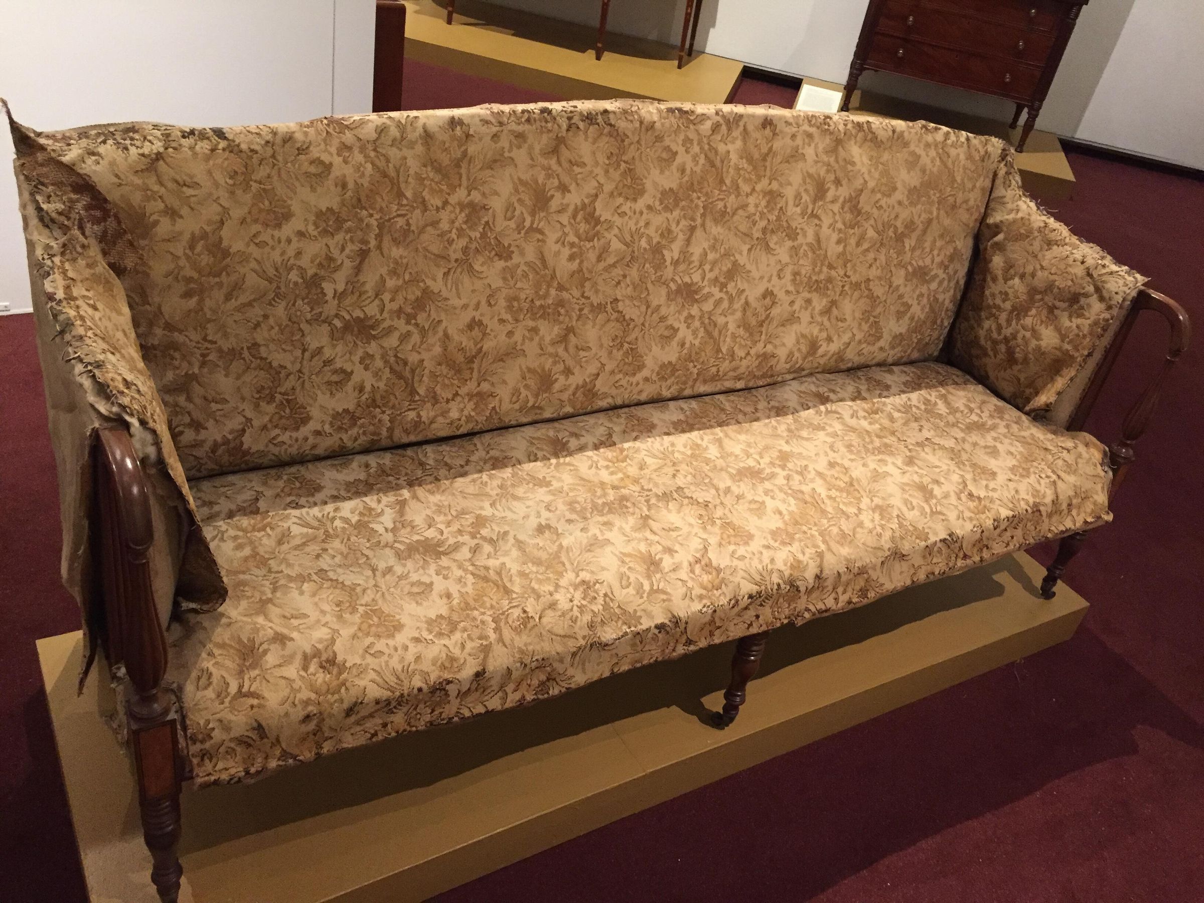 Sofa with a rounded crest rail and back and bowed front rail. Rounded arms with reeded vase supports resting on rectangular corner blocks with light and dark stringing and inlay; stiles behind arms also reeded. Plain square, slightly curved back legs and turned front legs; all legs with brass casters. The sofa has its original under-upholstery, webbing, stuffed straw or grass, and horsehair. Covered in modern floral upholstery over fragments of original plain-weave green wool; both the modern and original upholstery covered the back and ends of the sofa.Dimensions