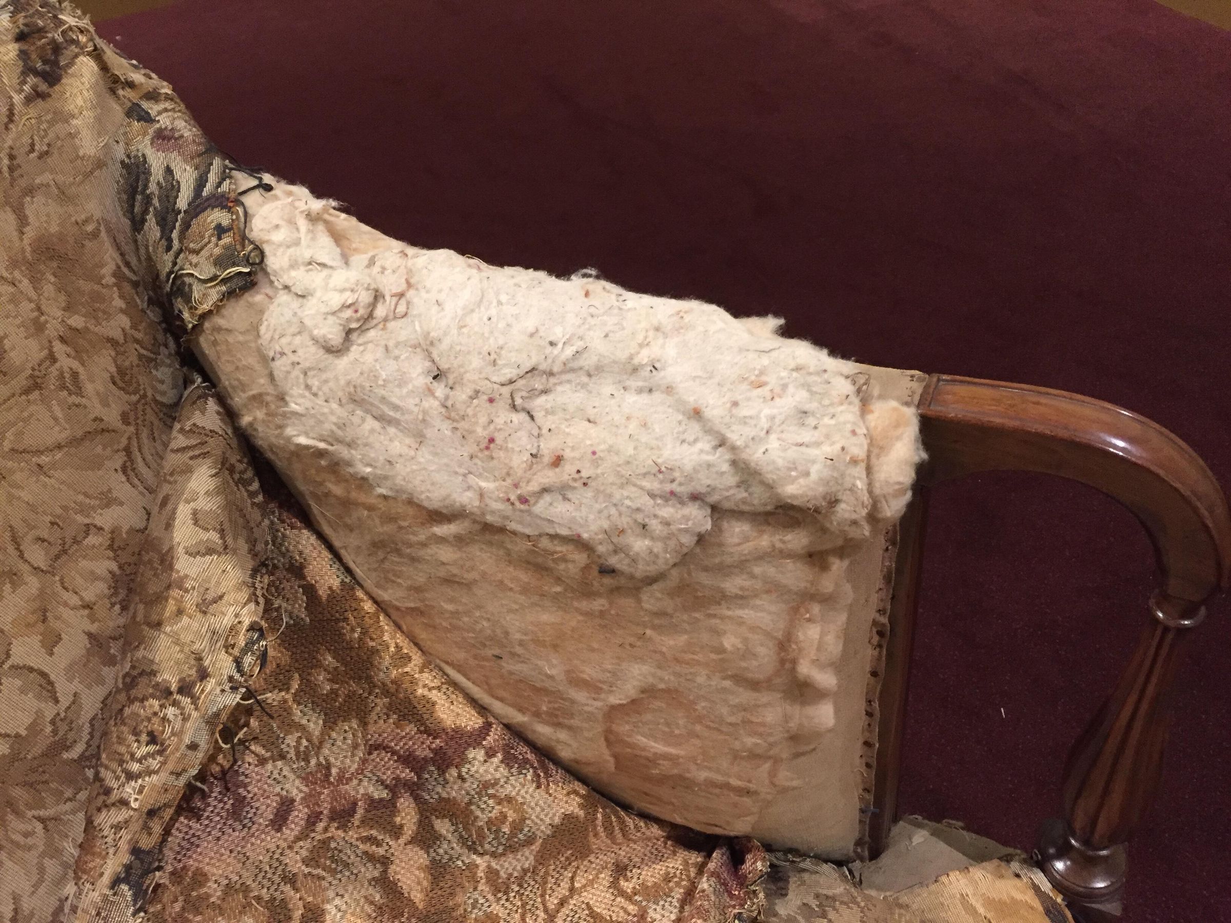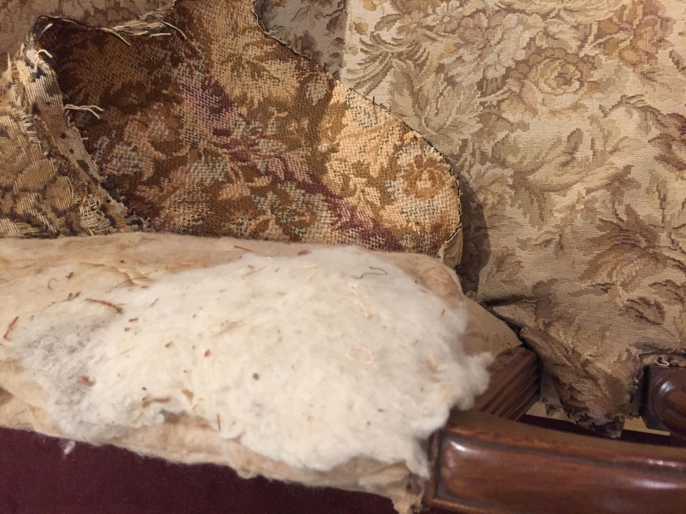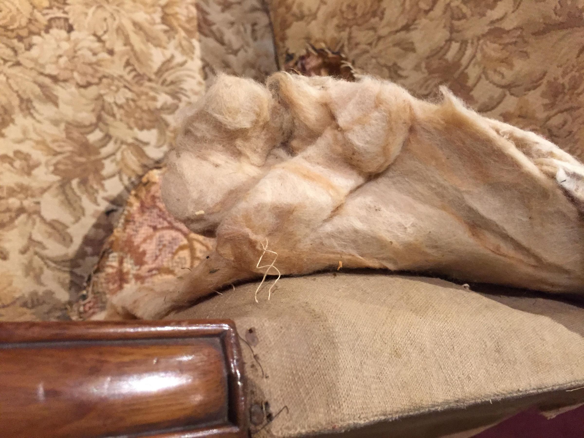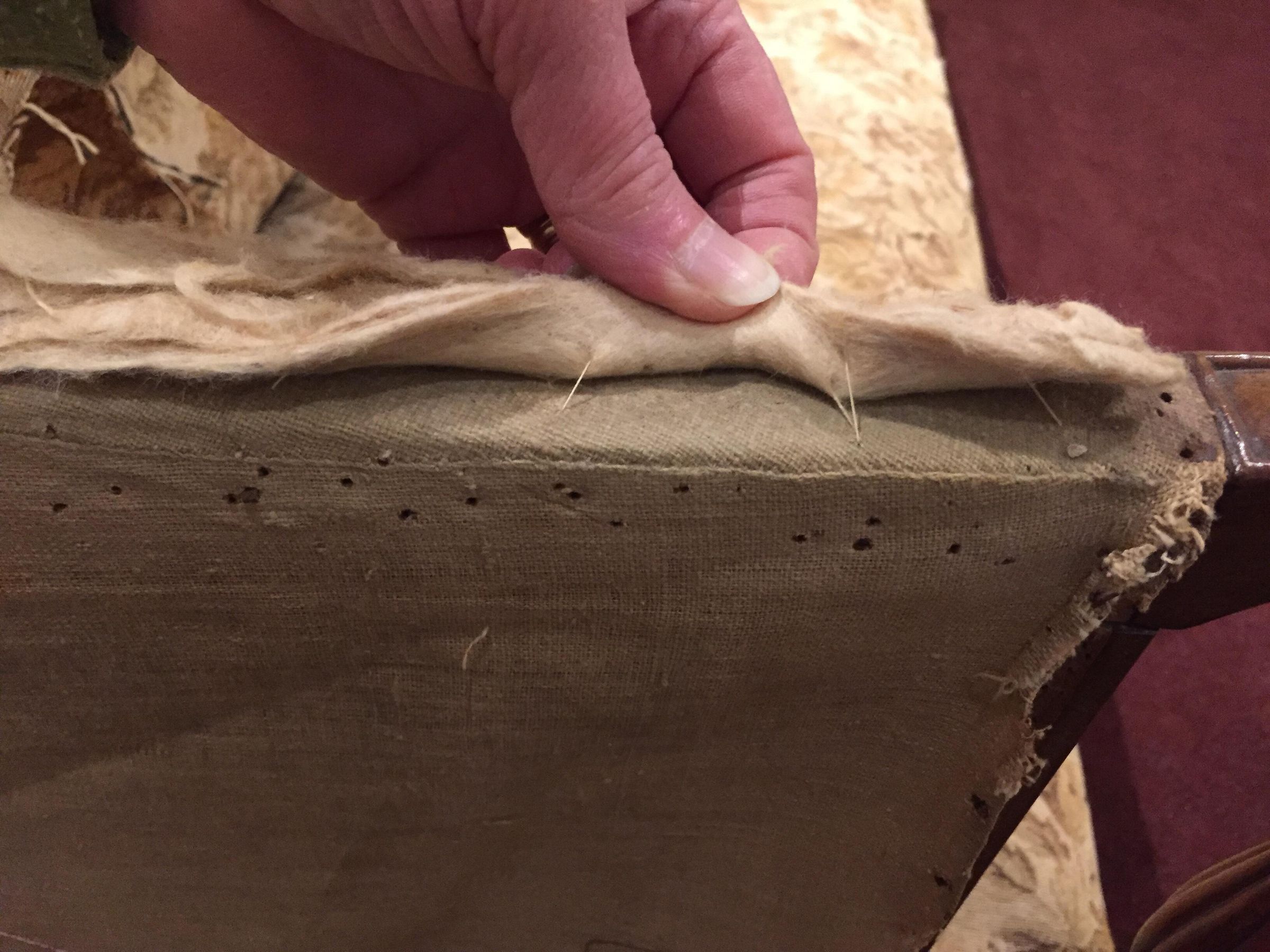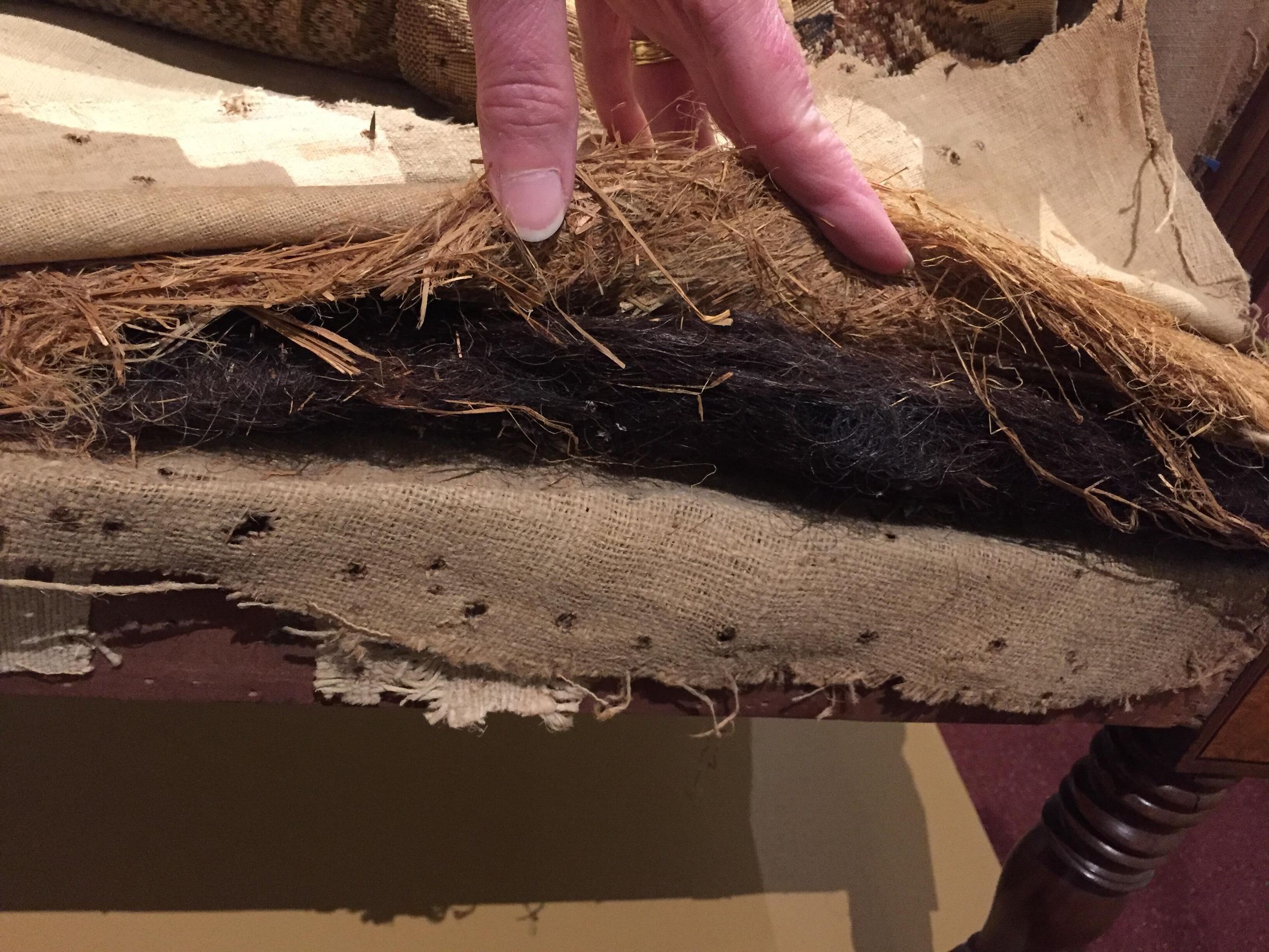 Sofa with a rounded crest rail and back and bowed front rail. Rounded arms with reeded vase supports resting on rectangular corner blocks with light and dark stringing and inlay; stiles behind arms also reeded. Plain square, slightly curved back legs and turned front legs; all legs with brass casters. The sofa has its original under-upholstery, webbing, stuffed straw or grass, and horsehair. Covered in modern floral upholstery over fragments of original plain-weave green wool; both the modern and original upholstery covered the back and ends of the sofa.Dimensions