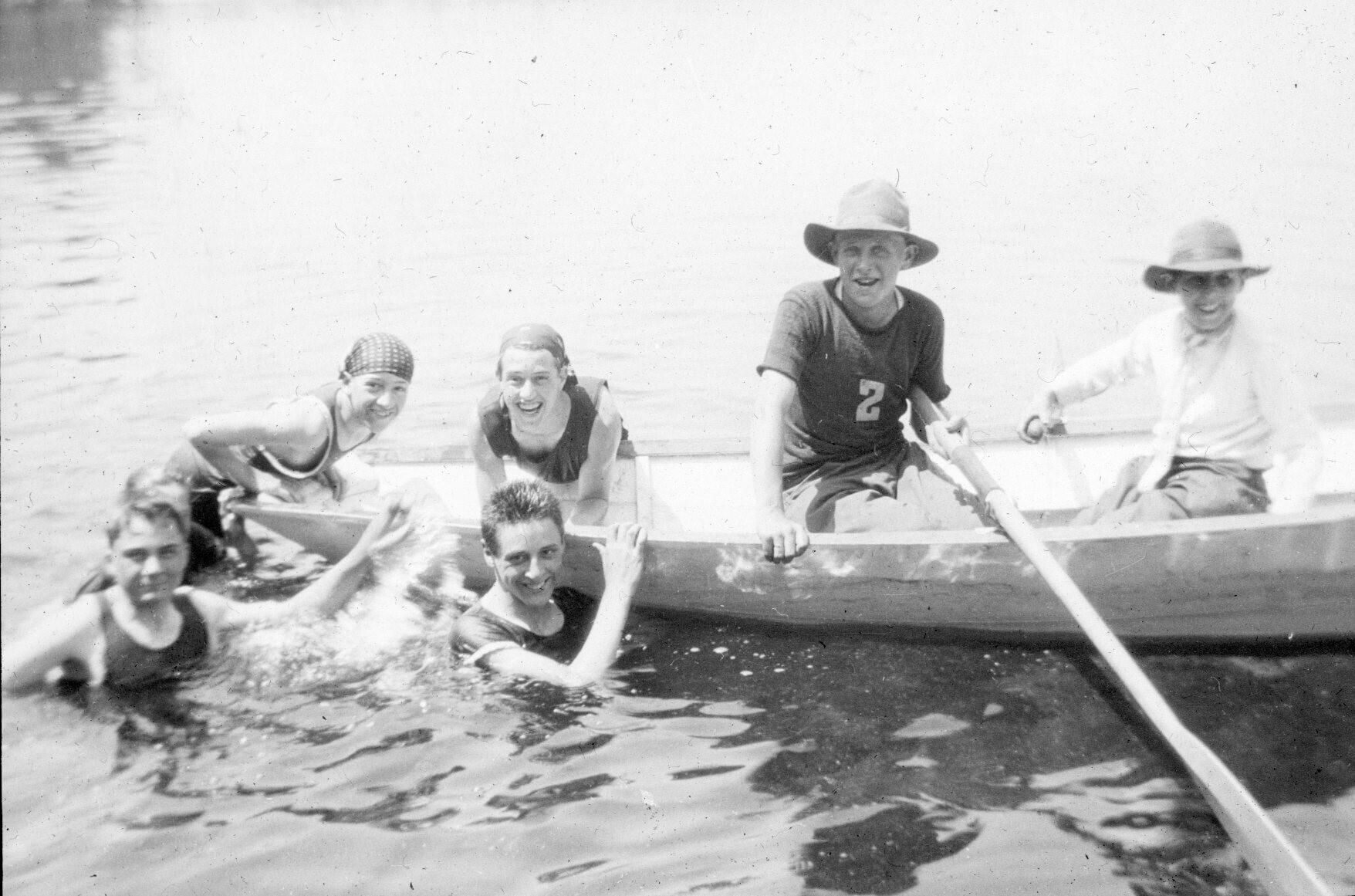 Glass lantern slide of Saco Boy Scouts in the Saco River. The Boy Scouts of America was founded in 1910. It is likely that this is the very first Boy Scout troop in Saco.