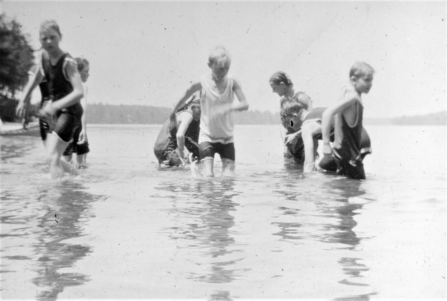 Glass lantern slide of Saco Boy Scouts in the Saco River. The Boy Scouts of America was founded in 1910. It is likely that this is the very first Boy Scout troop in Saco.