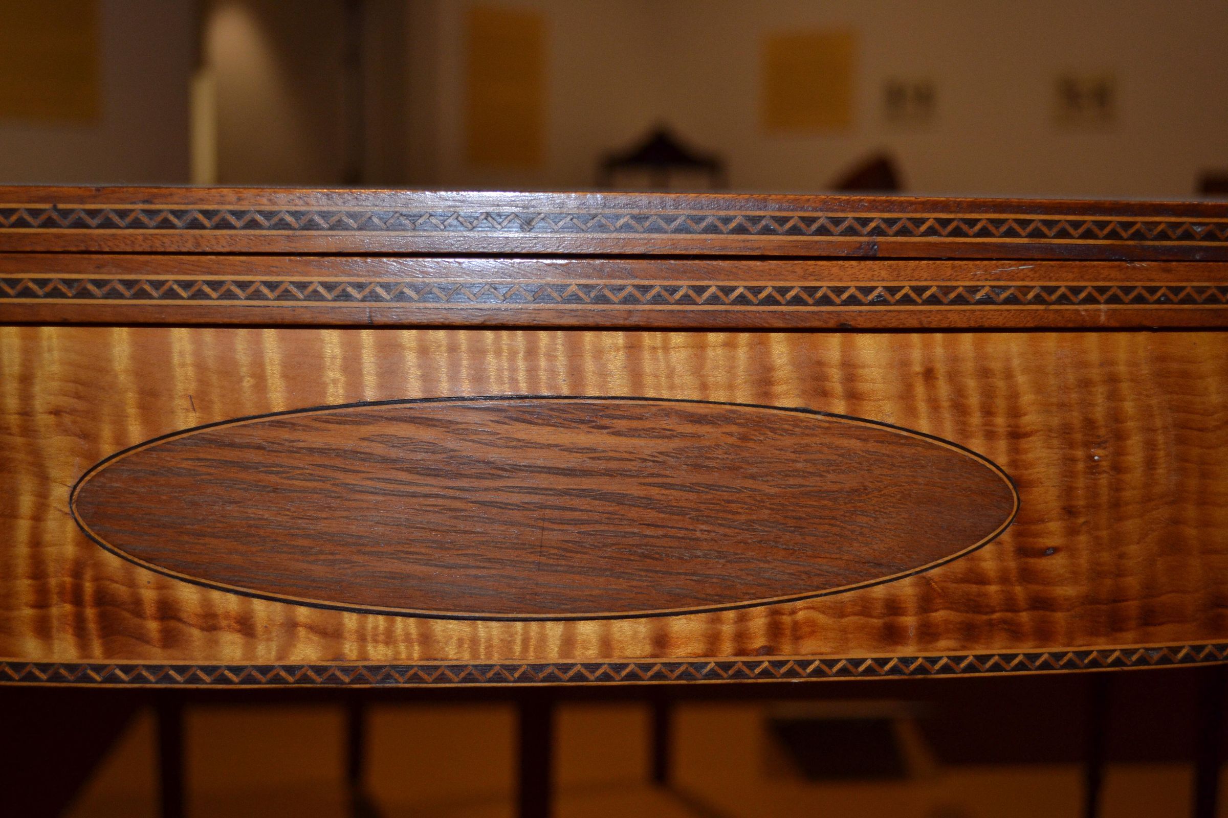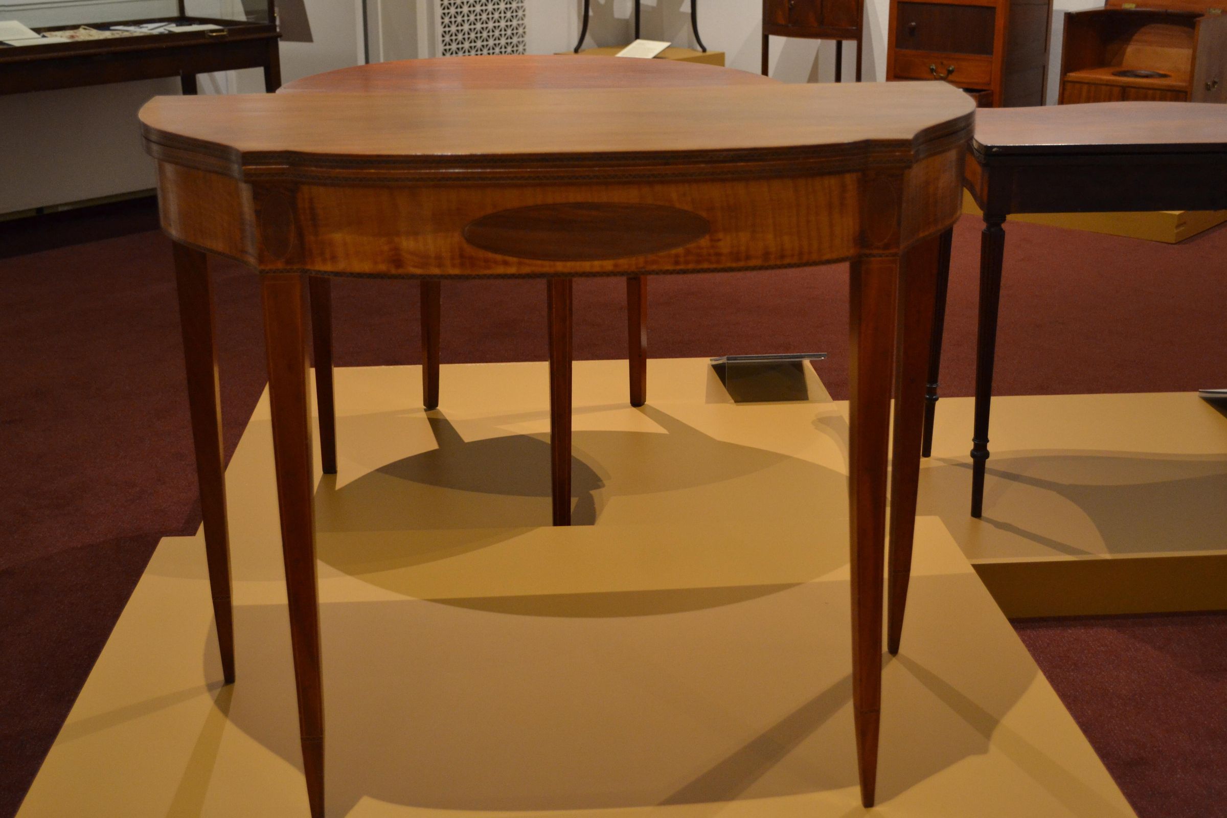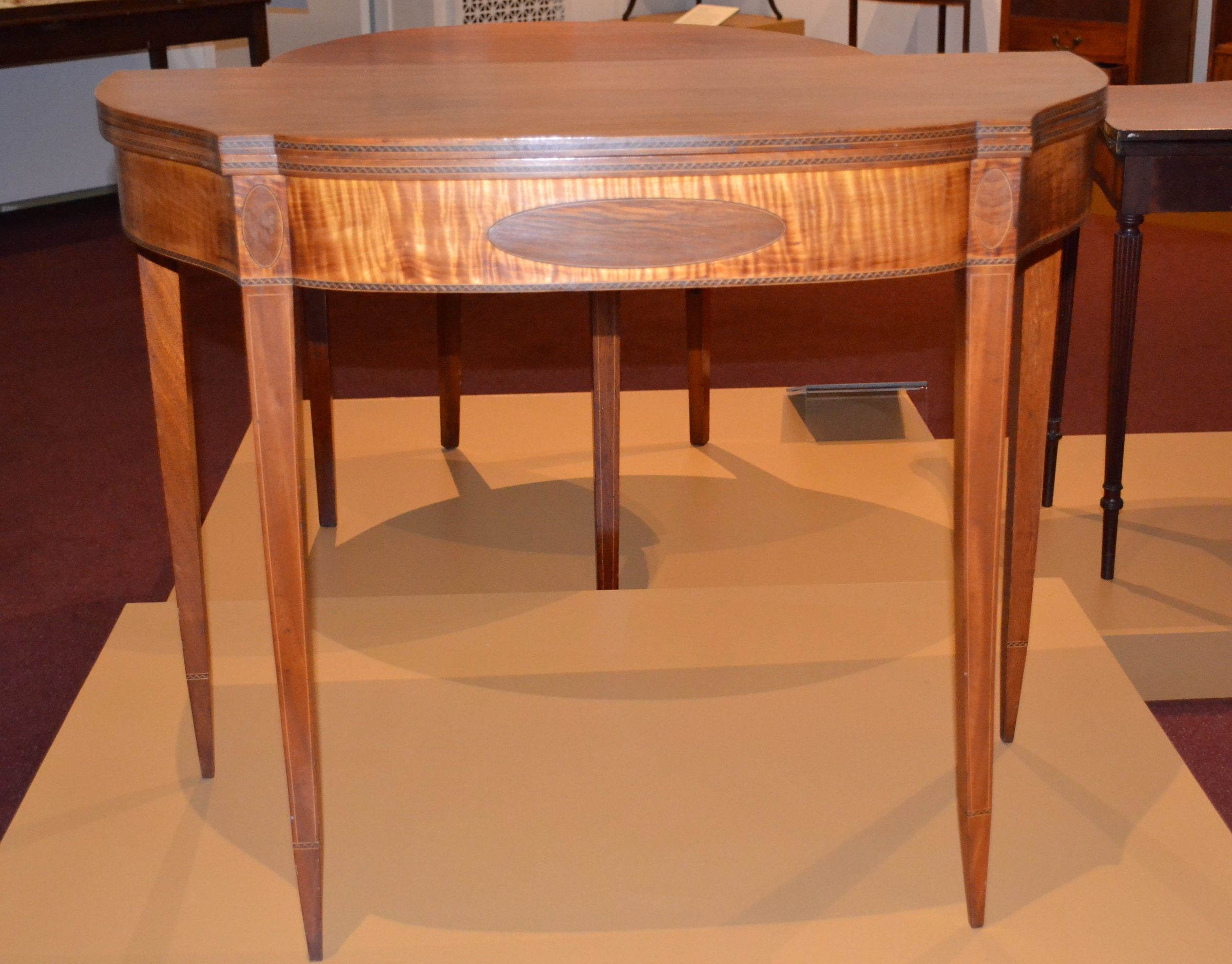 In the early 19th century, card playing became more socially acceptable for all classes of society, partly because of a decline in the influence of traditional Protestant morality. People indulged in this newly popular passion at home, in assembly houses, and in taverns. Those who could afford it purchased pairs of special tables for card playing for their homes so they could host fashionable card parties, which took place in the early afternoon or in the evening after dinner. Other games were played on card tables as well, including backgammon and chess. Almira McArthur, the donor of this pair of tables, noted they had been inherited from the Tucker family. Her grandmother, Marcia Tucker Cleaves, could have inherited them from either her father-in-law Daniel Cleaves, or her father Jonathan Tucker. If they belonged to Cleaves, they could have been two of the "4 mahogany card tables" listed in his 1818 probate inventory with a value of $24.