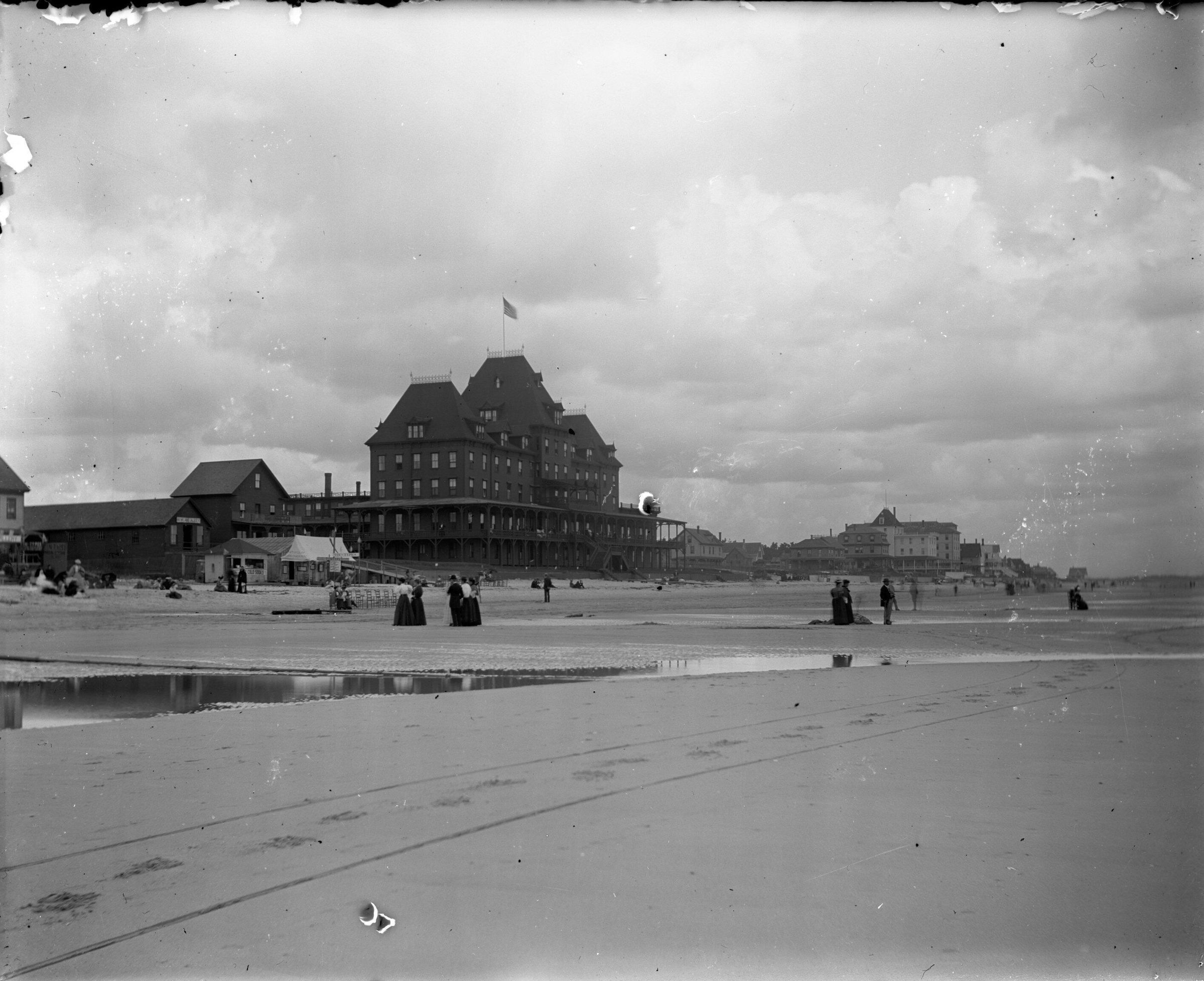 A glass plate negative photo of Hotel Fiske with people standing around on the beach in Old Orchard Beach, ME. "On Beach, Ocean Park, ME" is written on the plate sleeve. This photo was taken before the Pier was built in 1898.
