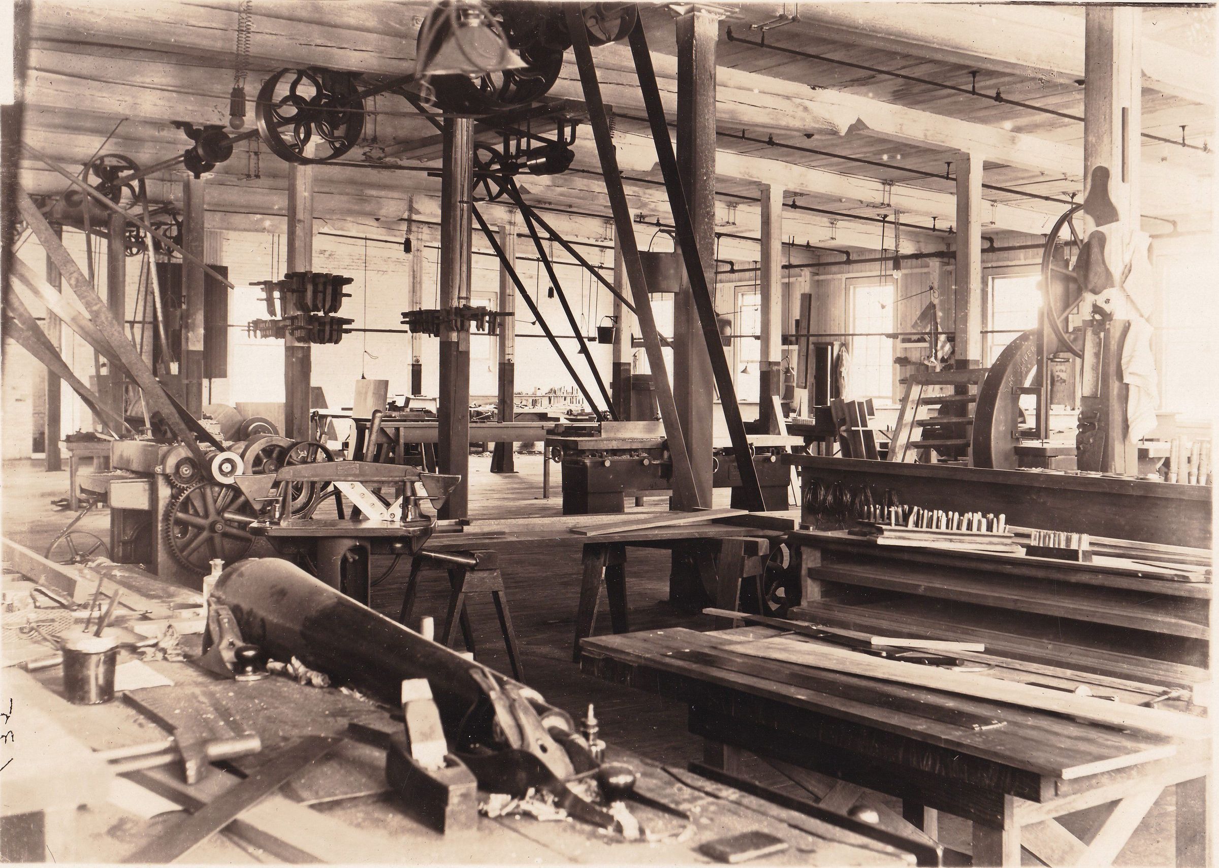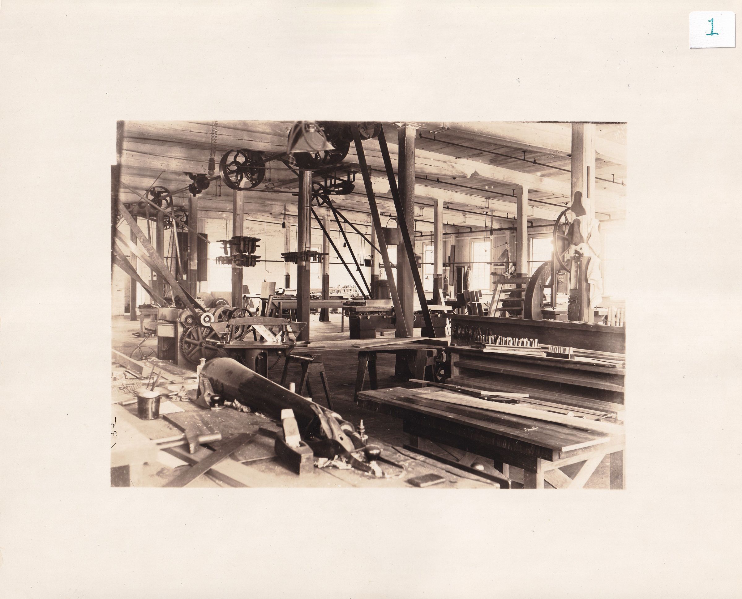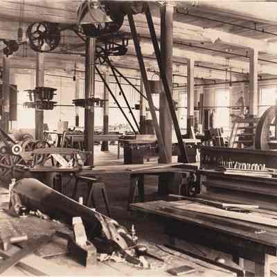 View across the Machine shop. Note the overhead shafts and belts attached to individual machines, as well as a band saw to the right.Made/Created