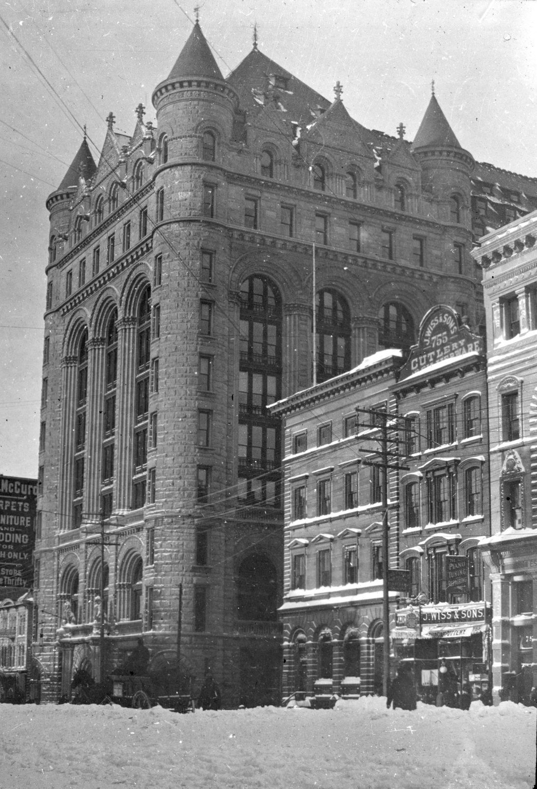 Glass lantern slide photo of the original Prudential Insurance Building in Newark, NJ.