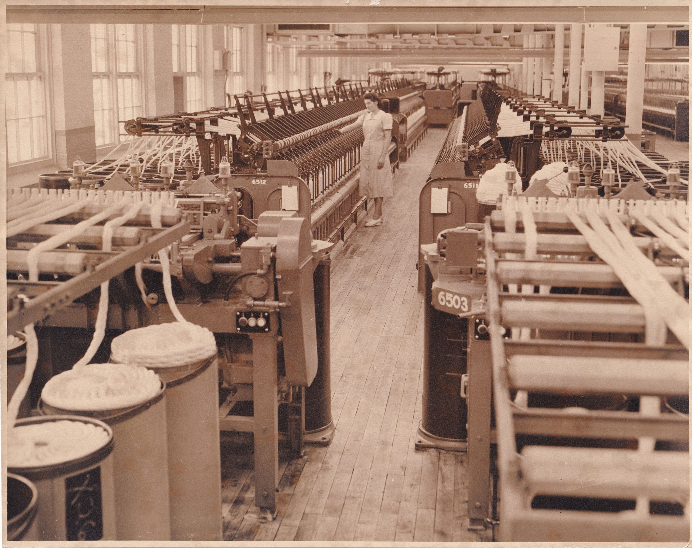 Cotton came from the carding machines in a rope-like sliver that was automatically coiled into cans. It was then fed from the cans in the foreground through the drawing frames. After the drawing frames, the strands were sent through the roving machinery which inserted a slight amount of twist.