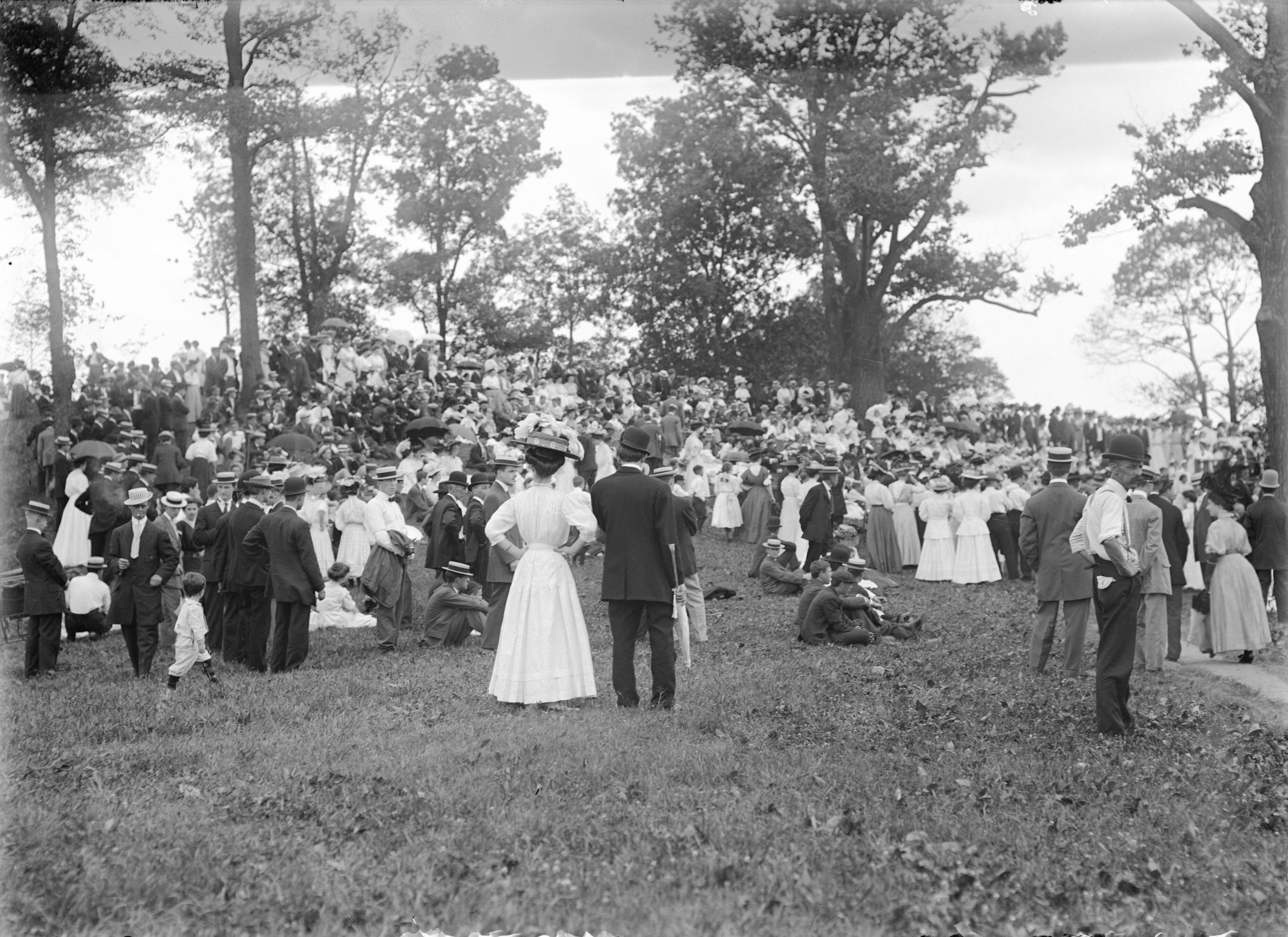 Glass plate negative photo of a large group of people assembled at the Cyrus Woodman Reservation/Appalachian Mountain Club (today known as Pleasant Point Park) in Hollis for the Dorcas Fair on July 30, 1912. The Dorcas Fair was held at Quillcote, Kate Douglas Wiggin's property, in prior years.