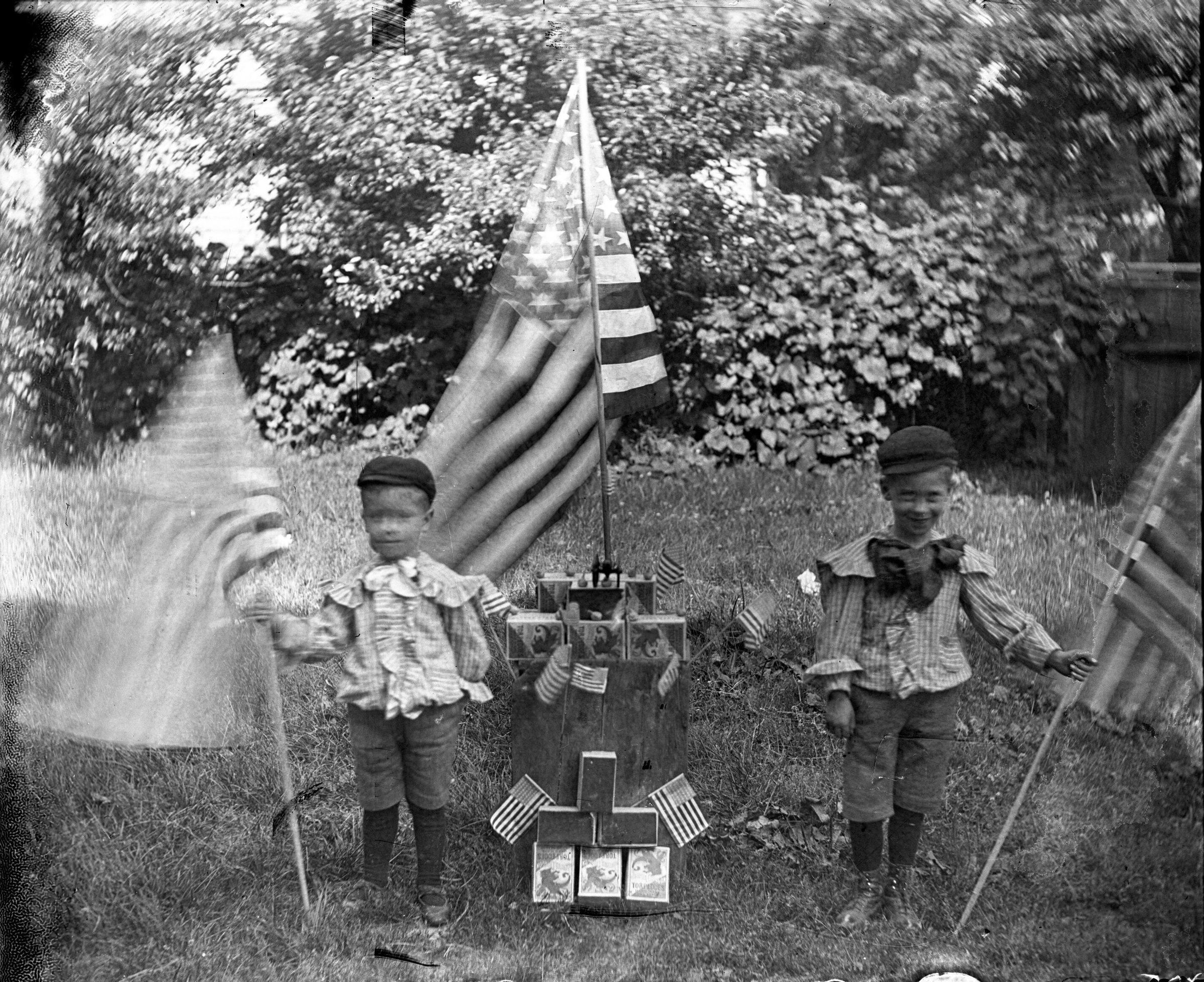 A photo of two boys (likely Charles and Everett) waving American flags, celebrating Fourth of July. "Fourth of July" is written on the plate sleeve.Made/Created