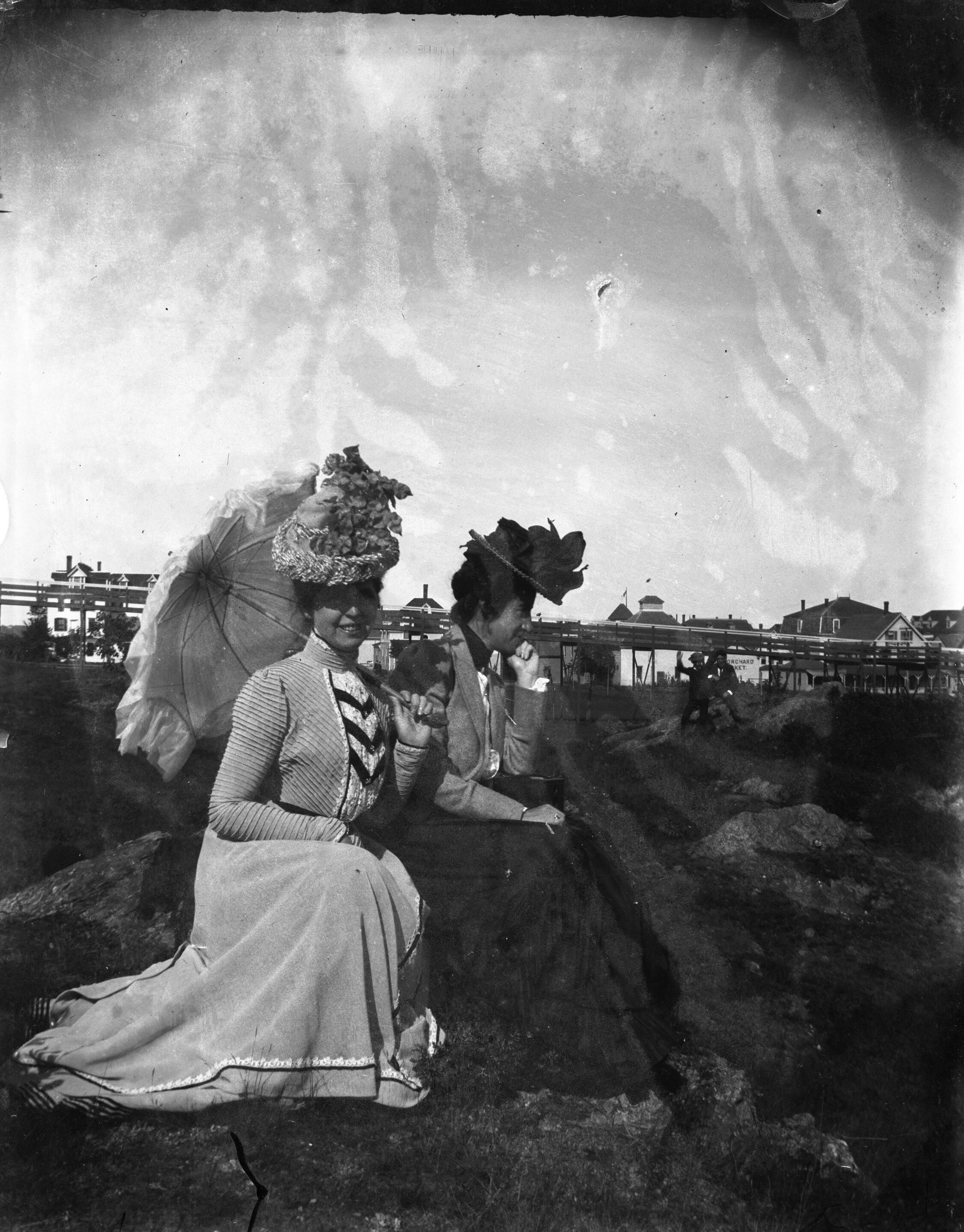 Glass-plate negative of two women at Old Orchard Beach wearing long dresses, fancy hats, one with an umbrella. Hotels and pier in background. Two boys can be seen goofing off for the camera in the background.