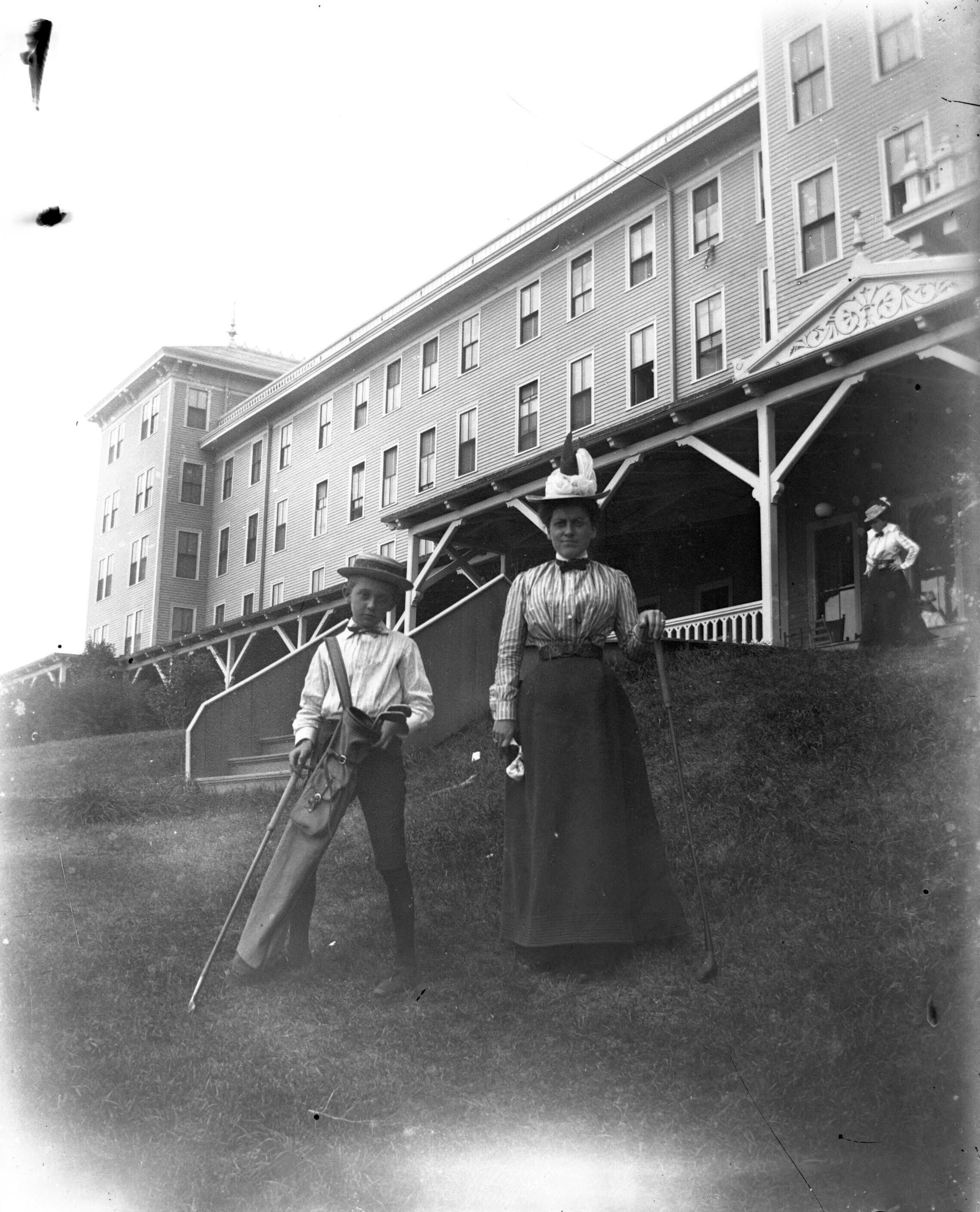 Glass-plate negative of a woman and young boy standing in front of the Old Orchard House in Old Orchard Beach, ME with golf clubs. The Old Orchard House was built by Ebenezer Staples in 1876.